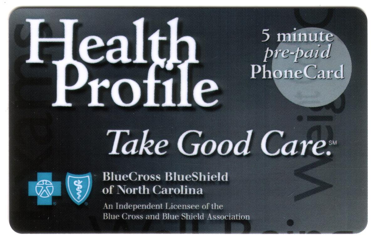 This collectible card promotes Blue Cross Blue Shield of North Carolina and features strong branding related to health insurance and health care services. The front of the card prominently displays the Blue Cross Blue Shield logo, composed of a blue cross and a blue shield, which are well-known trademarks associated with health insurance. The card includes text emphasizing health profiles, reflecting a connection to health care management or monitoring.