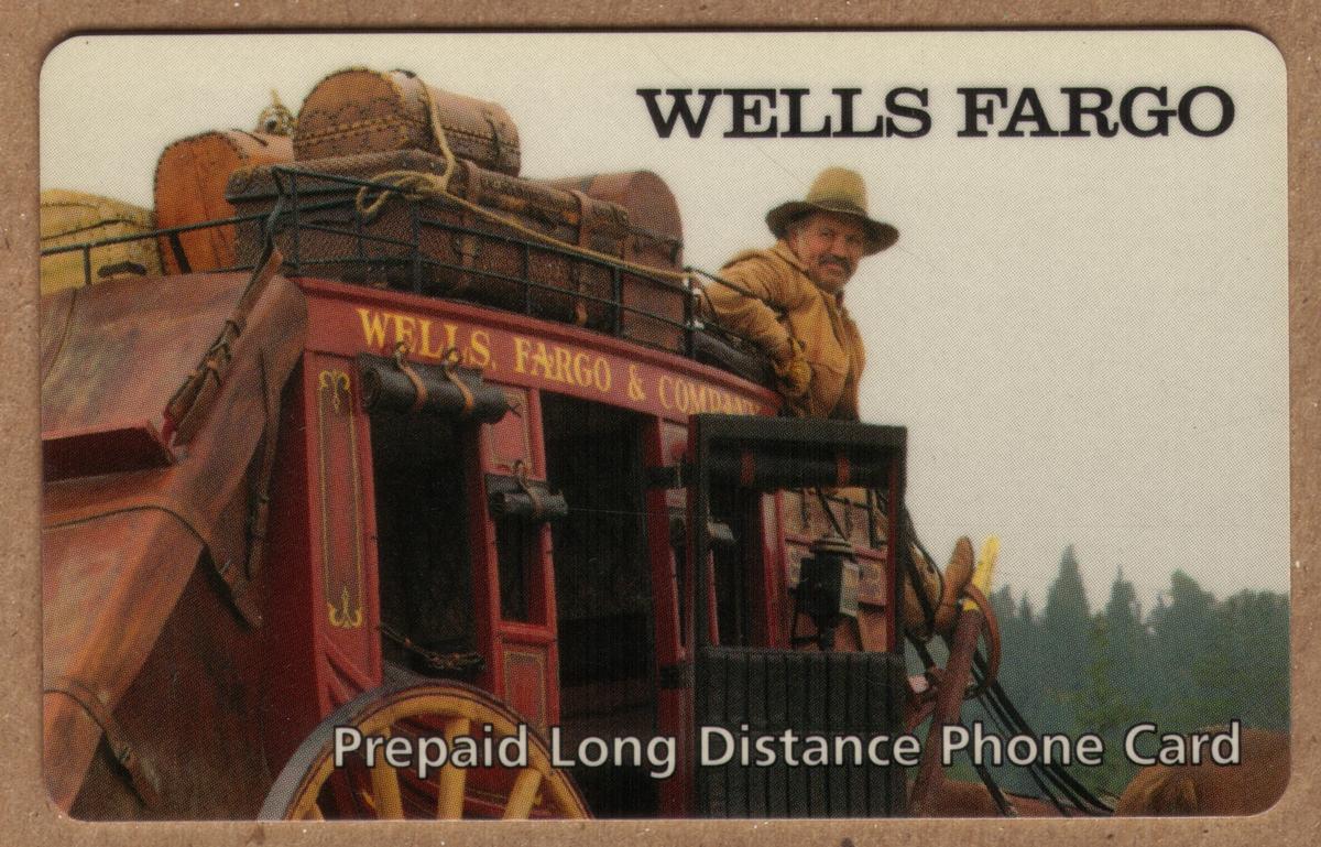 Vintage Wells Fargo stagecoach scene with driver, logo, and details, blending Americana nostalgia with prepaid long-distance calling functionality. |