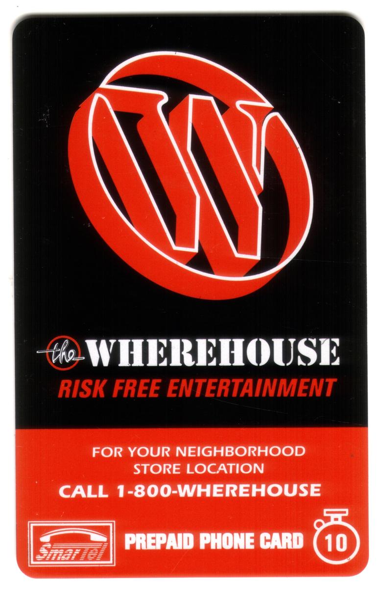 The phone card is a specimen, as indicated by the word "SPECIMEN" printed across the front. The overall layout is straightforward and informative, aimed at promoting The Wherehouse’s entertainment offerings through a branded telephone card issued by SmarTel Communication.
