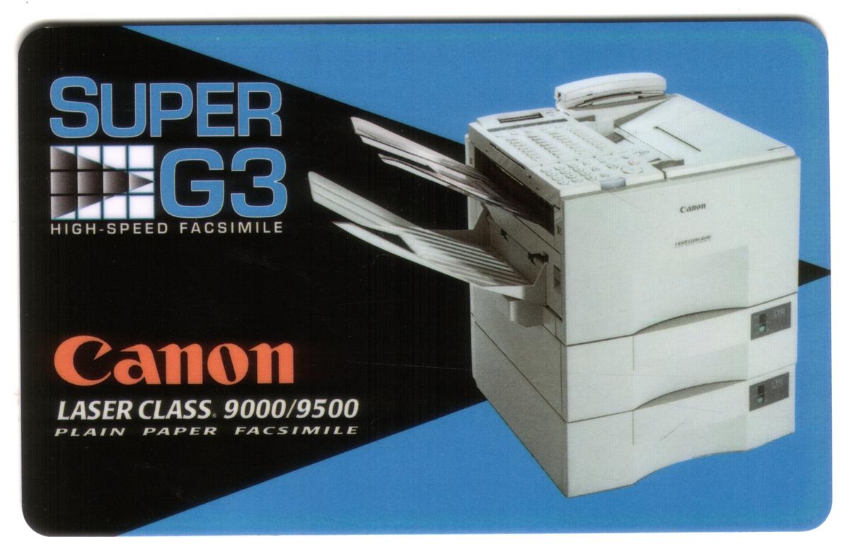 This item aligns with uses tied to office technology and photocopiers, highlighting trademarks and logos central to Canon’s facsimile machines. The card emphasizes promotion of Canon’s laser fax machines designed for efficient communication solutions.