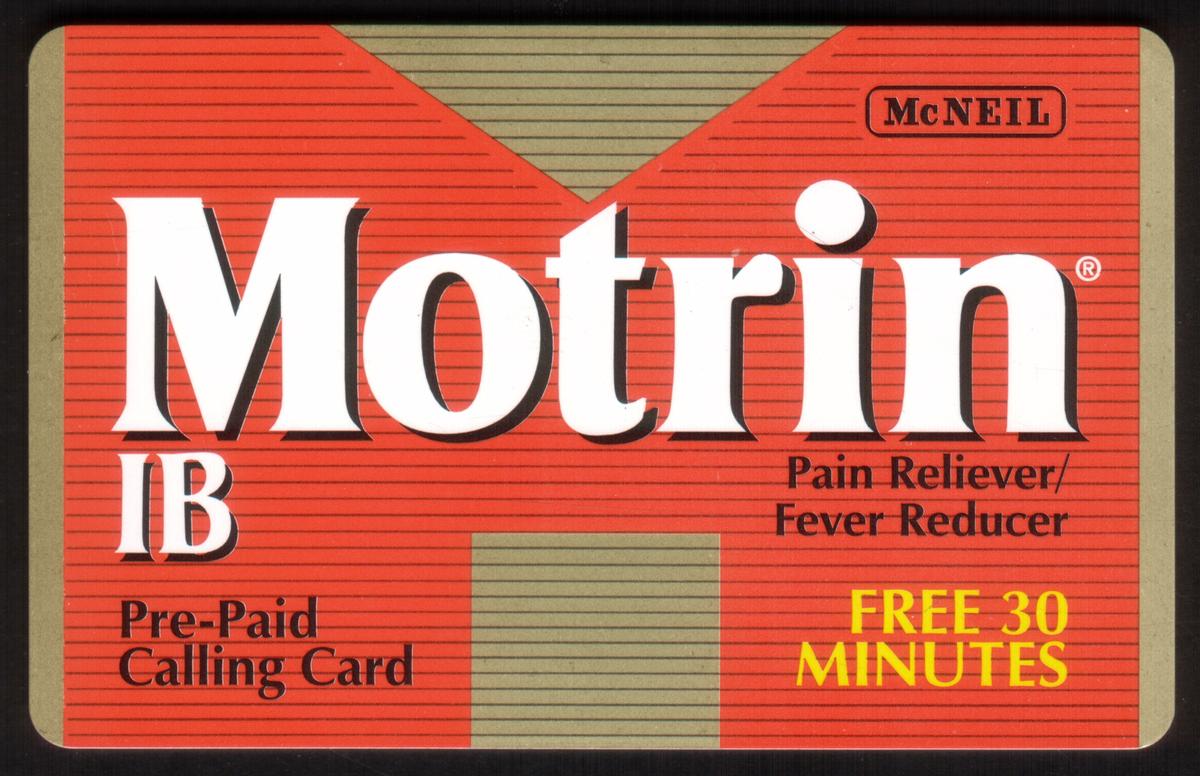 This is a Motrin IB Pre-Paid Calling Card featuring McNeil branding. The card is primarily red with horizontal black stripes and a beige section in the center. The large, bold white text "Motrin" spans most of the card, with "IB" displayed just below it on the left side. In smaller black text, the card states "Pain Reliever / Fever Reducer" below the McNeil logo, which is enclosed in a small rectangle on the top right corner.