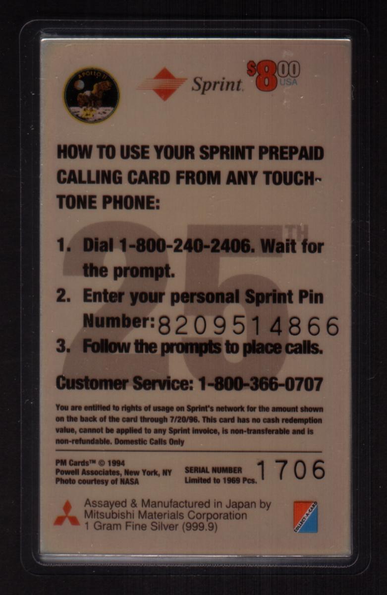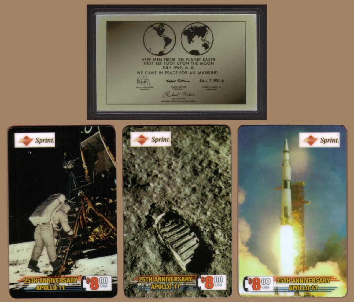 This collection features four United States $8 collectible phone cards commemorating the 25th anniversary of the Apollo 11 lunar landing, sponsored by Sprint. Each card celebrates a significant moment or symbol from the historic Apollo 11 space mission that first landed men on the moon in July 1969. The cards display high-quality photographic images related to outer space exploration and NASA’s achievements.