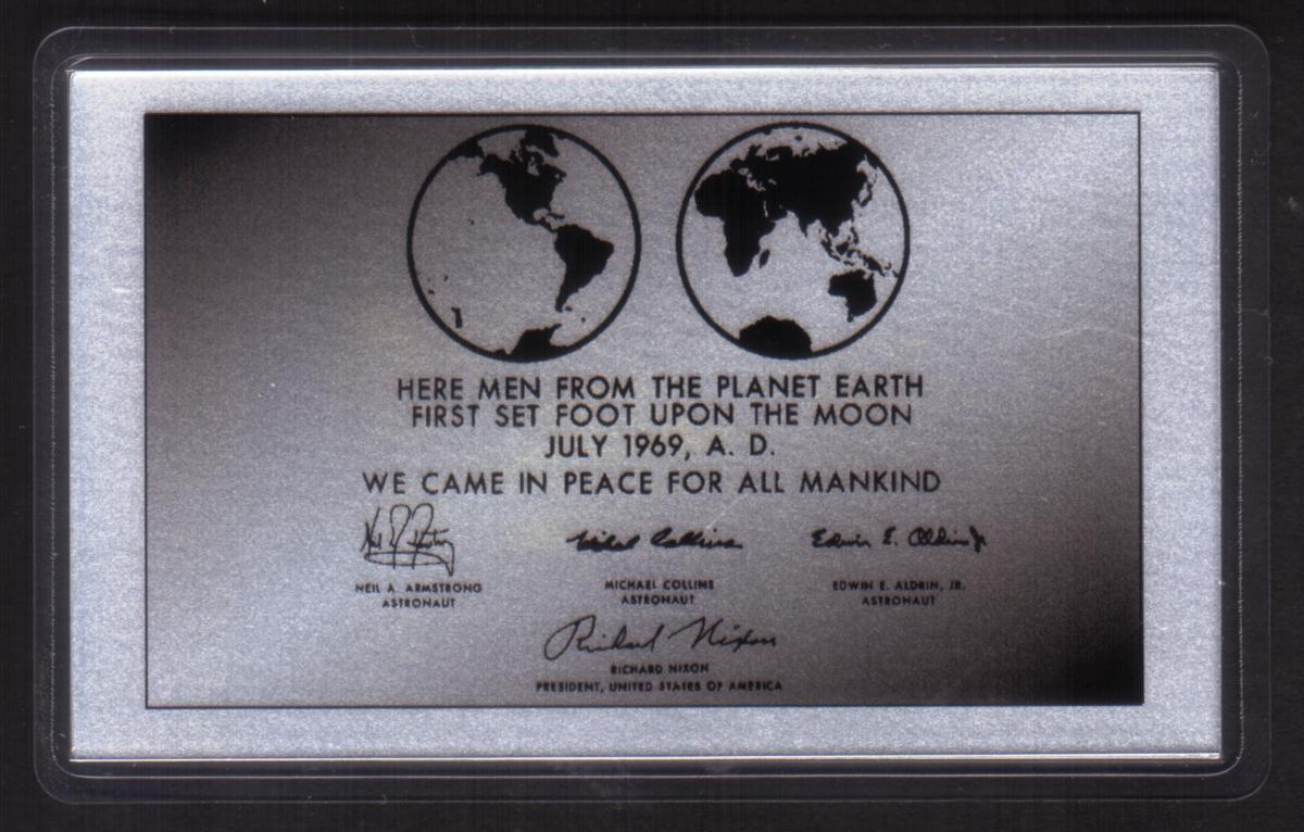 Set of four $8 Apollo 11 anniversary cards celebrating lunar landing, featuring Saturn V launch, lunar surface, astronaut footprints, and peace message. |