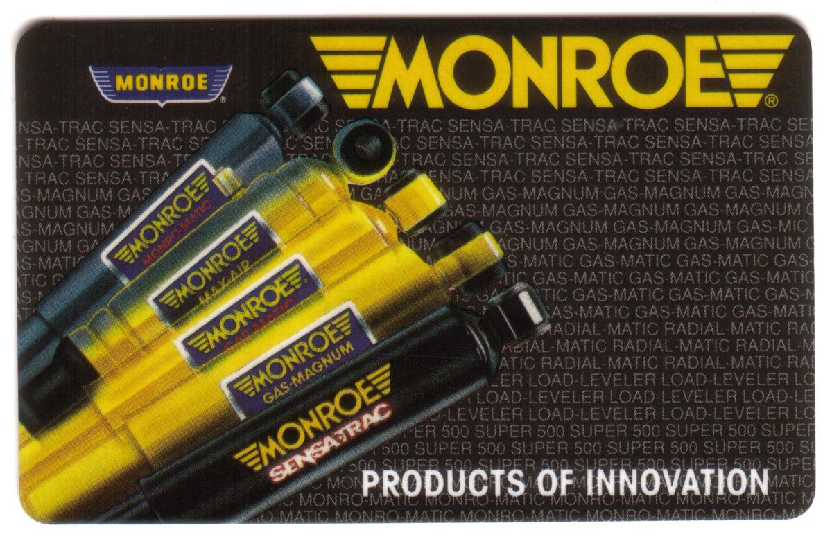 This collectible promotional card features a prominent logo and branding for Monroe SensaTrac Shocks, with the phrase "Products of Innovation" displayed clearly. The card highlights the automotive industry, specifically focusing on automotive struts and shock absorbers. The branding emphasizes the Monroe name, known for manufacturing suspension components for automobiles.