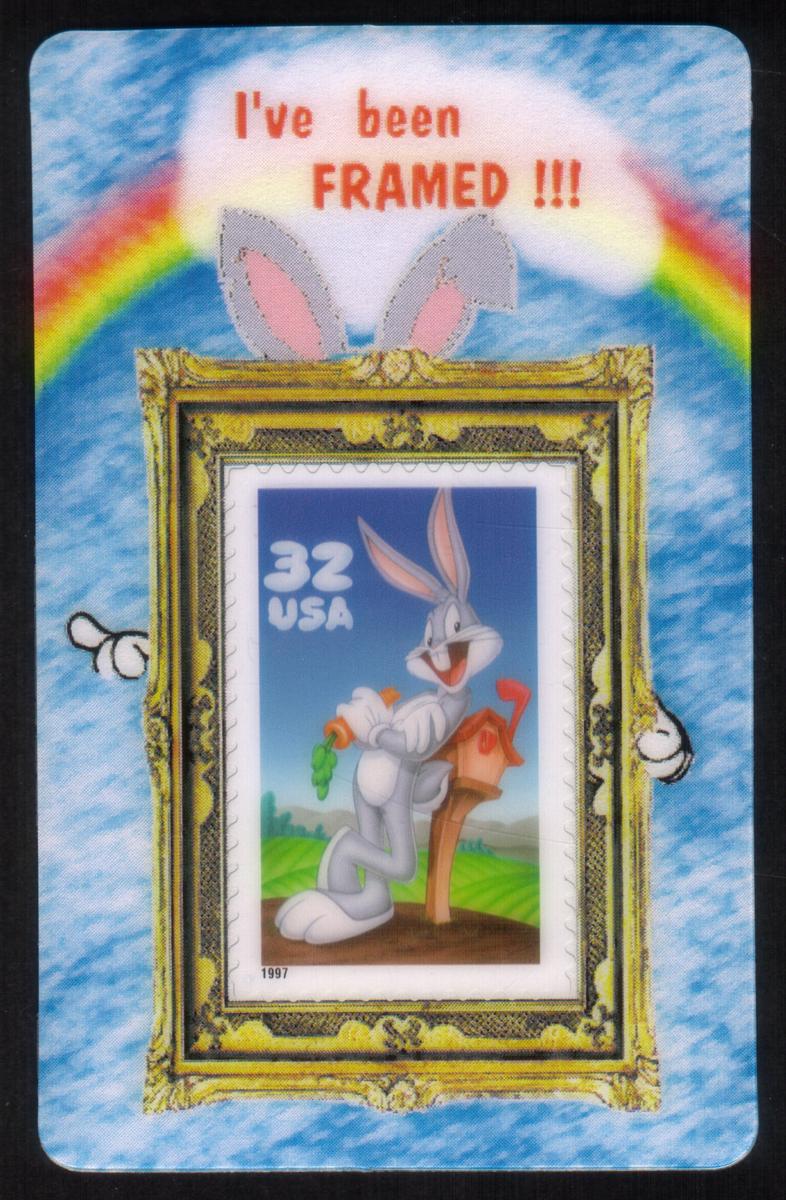 Vibrant Bugs Bunny design with 32-cent 1997 USA stamp, ornate gold frame, rainbow, playful text, and animated elements, blending cartoon art and stamp collecting. |