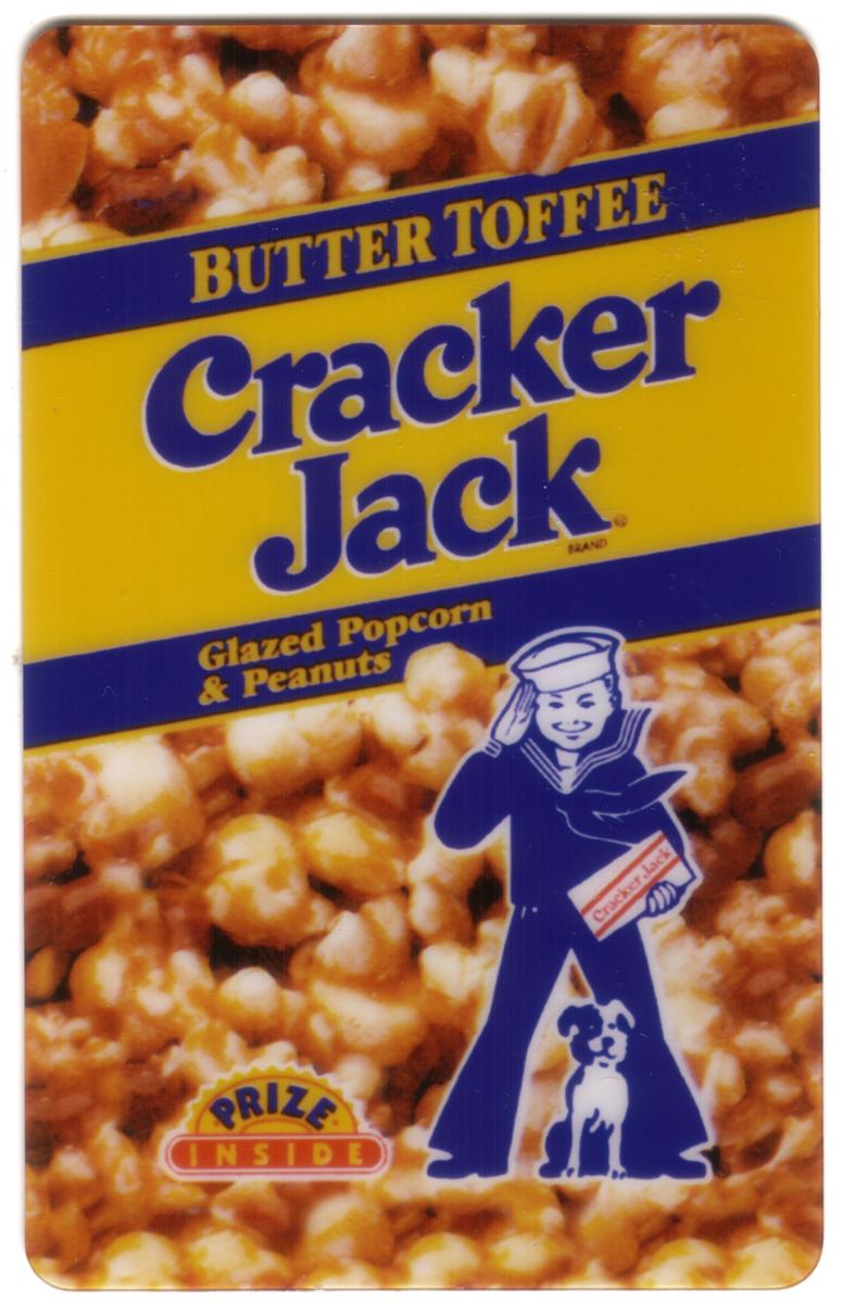 Near the bottom left corner, a small emblem with a red and yellow color scheme reads "PRIZE INSIDE," which is part of the Cracker Jack branding tradition that includes a prize inside the package. The card is produced by USACard Corporation, which is indicated by the design style and production quality. The overall appearance reflects Americana snack food heritage centered on this iconic Cracker Jack Butter Toffee popcorn and peanuts product.