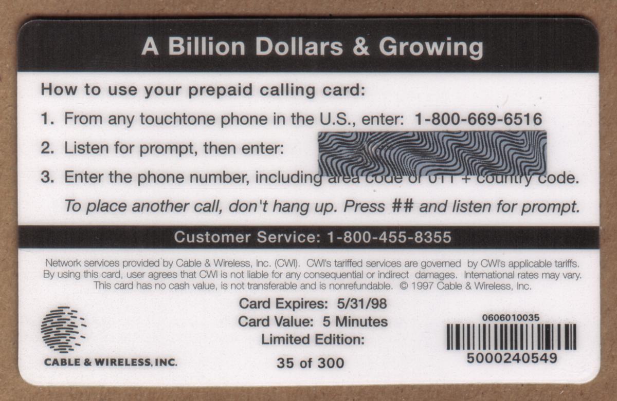 Since we have the world's largest inventory of USA phonecards for collectors, you will not necessarily receive the identical serial/batch/PIN number that we have scanned/pictured.