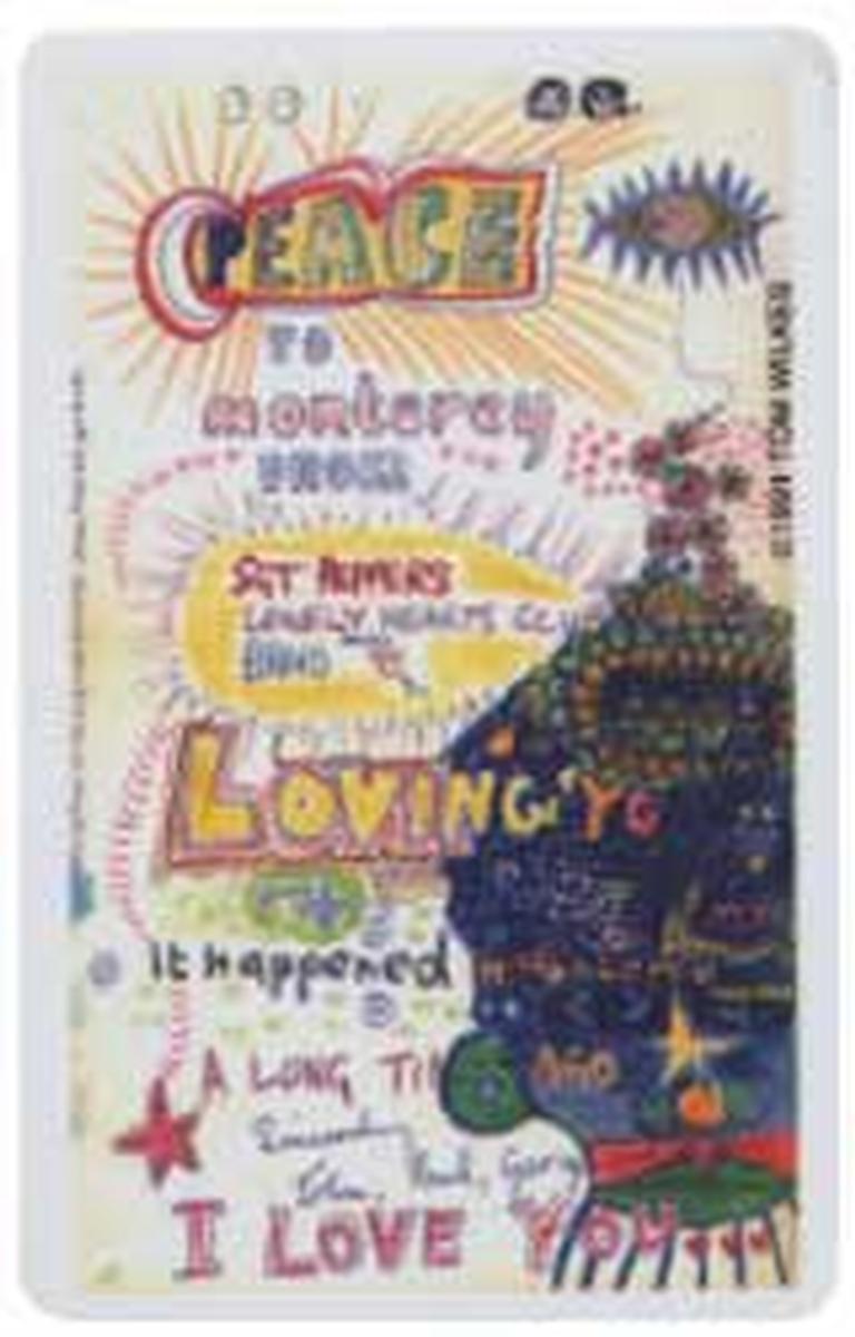 Vibrant 1967 Monterey Pop Festival phone card featuring psychedelic art, bold peace symbols, handwritten messages, whimsical details, and cultural icons of the era. |
