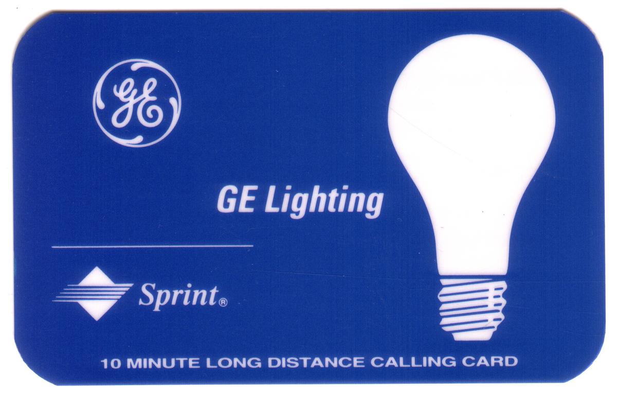 This collectible phone card features a promotional design related to electronics and lighting, specifically highlighting GE Lighting. The front of the card shows a stylized image comprising a large white light bulb set against a blue rectangular background. The blue background fades subtly from a lighter gradient at the center outward.