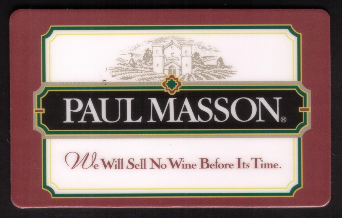 This collectible phone card features a promotional advertisement for Paul Masson wines and liquor. The card prominently displays the text "We Will Sell No Wine Before Its Time," which is a well-known slogan associated with Paul Masson. The overall design blends marketing elements with a clear emphasis on the brand's commitment to quality.