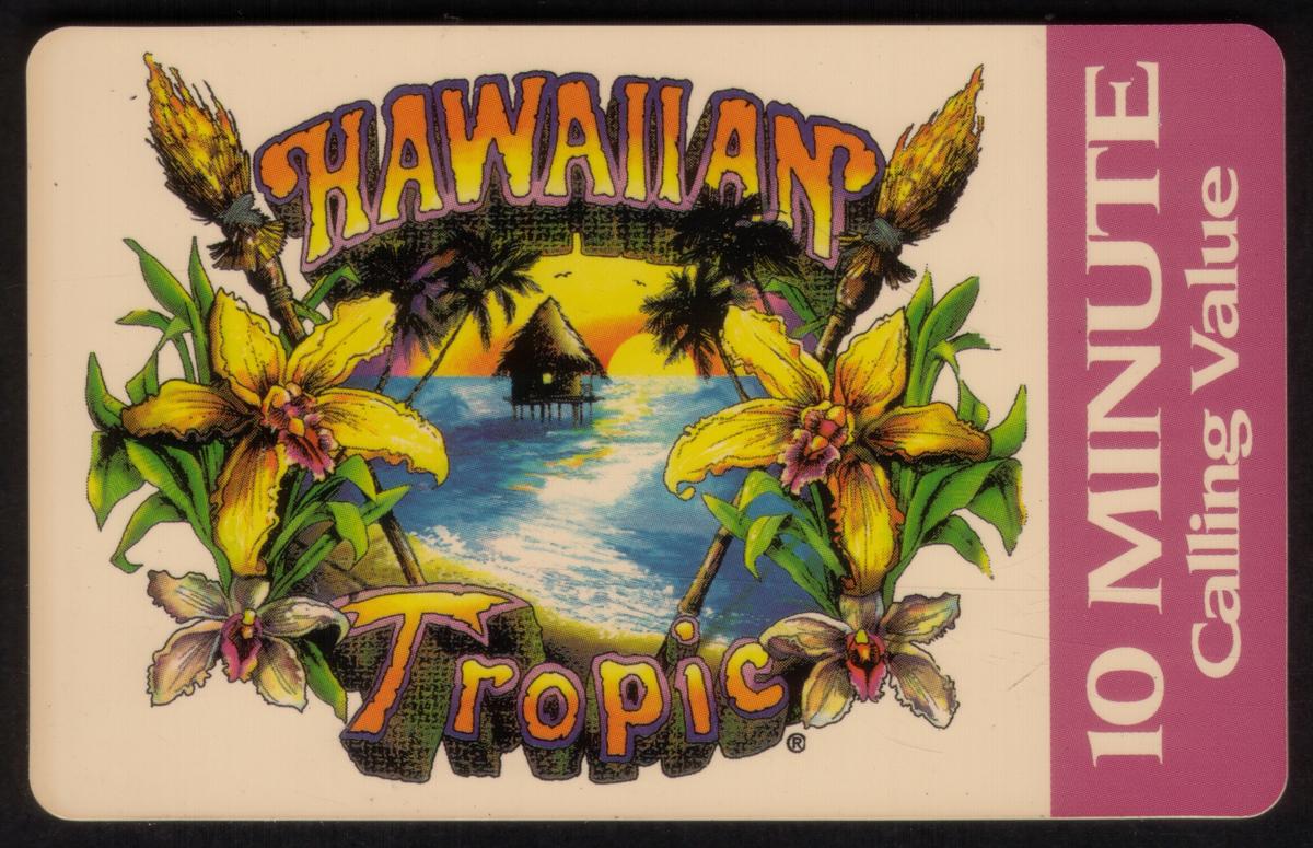 This collectible phone card features promotional imagery related to Hawaiian Tropic suncare products. The card prominently showcases swimsuit models wearing swimsuits that highlight the brand’s association with tanning and skincare products. The visual design includes logos and trademarks connected to Hawaiian Tropic, emphasizing its focus on sun protection and tanning. The setting appears bright and summery, complementing the theme of suncare and beachwear.