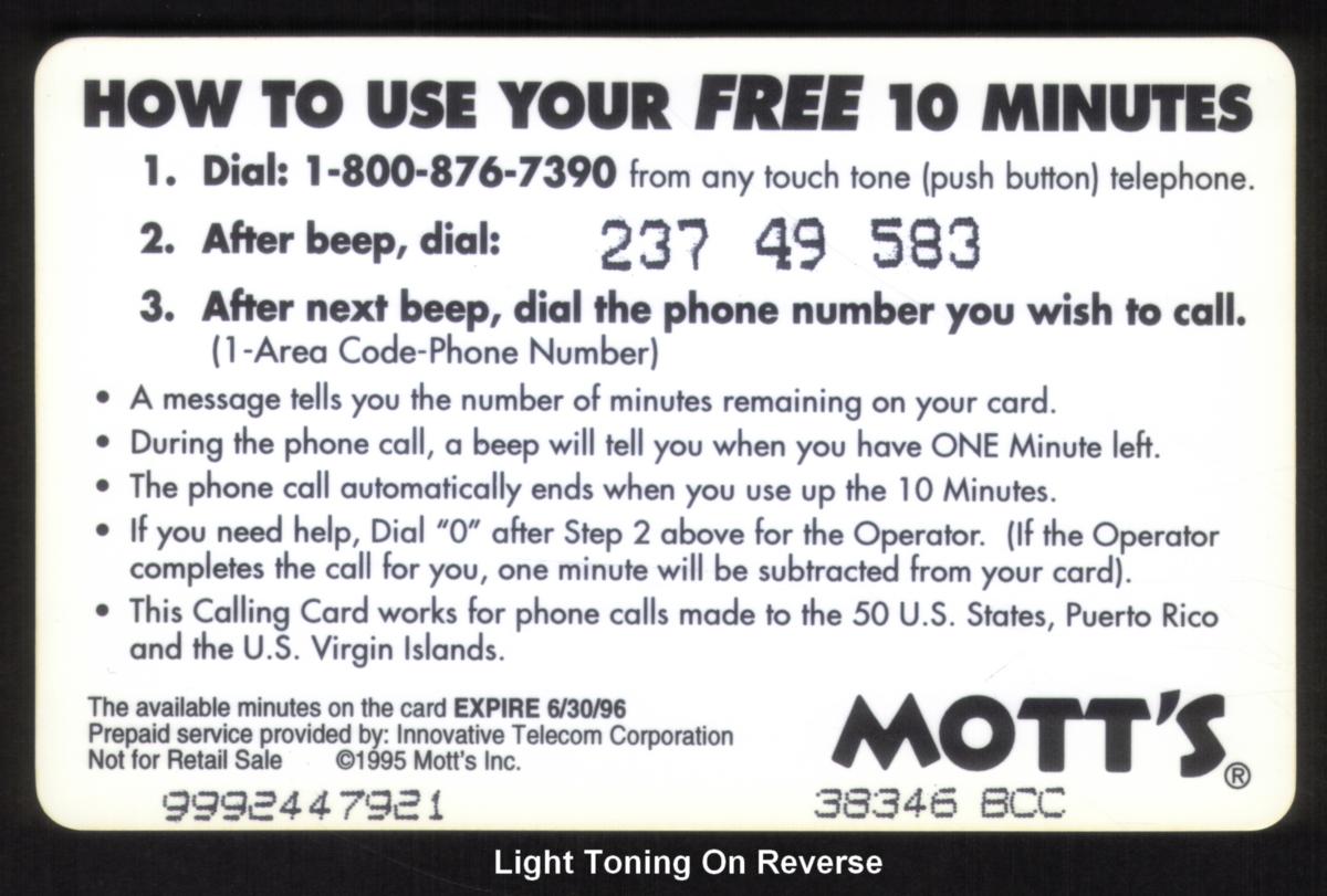This card is a used edition with light toning reported on the reverse, and it was produced by Innovative Telecom. It also connects to Mott's promotional efforts, as noted in the keywords. The card’s bright colors and clear Nickelodeon and calling card text make it a distinctive collectible item tied to 1990s children’s television culture.