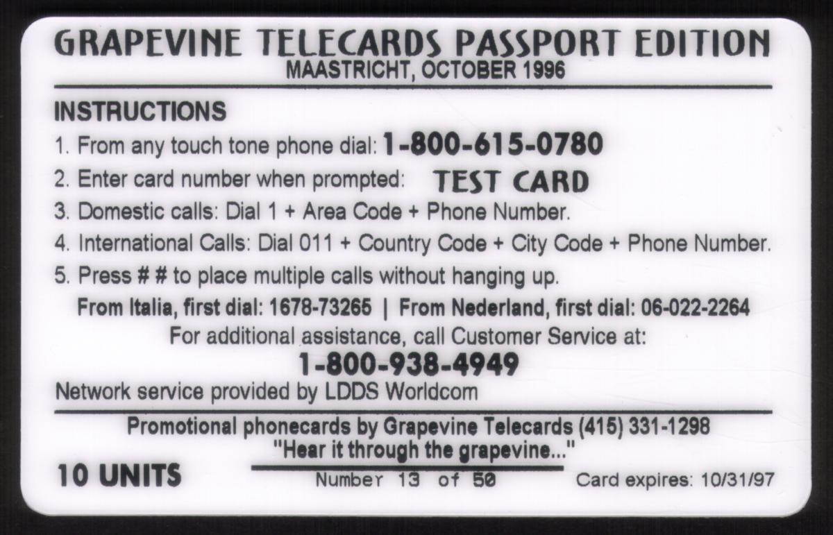 This collectible phone card commemorates the 20 Years of Phonecards event held in the Netherlands. It is part of the "TEST" Set of 2 issued by Grapevine Telecards, produced specifically for the Expo 10u CardEx '96 in Amsterdam. The card prominently features the official logos of Telecard Events and LDDS, with the location "Amsterdam" and the year "1996" clearly displayed, anchoring the card to this significant phone card exhibition.