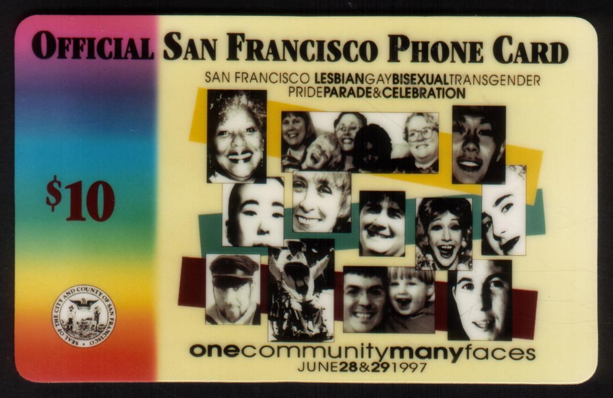 This collectible phone card honors the official San Francisco Gay Pride celebration held in June 1997. The front features a vibrant rainbow arc that crosses the card diagonally from lower left to upper right, symbolizing the LGBTQ+ community and pride. Below the rainbow, the card prominently displays the words "ONE COMMUNITY MANY FACES" in bold lettering, emphasizing inclusivity and diversity within the community.