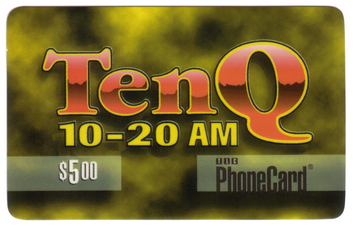 This collectible phone card features the branding "TenQ" prominently in large, stylized letters colored with a gradient from red to orange, resembling a sunset. Below the name, the frequency "10-20 AM" is displayed in bold yellow text. The card’s background is a smoky green and black pattern with a cloudy texture, adding depth to the design.