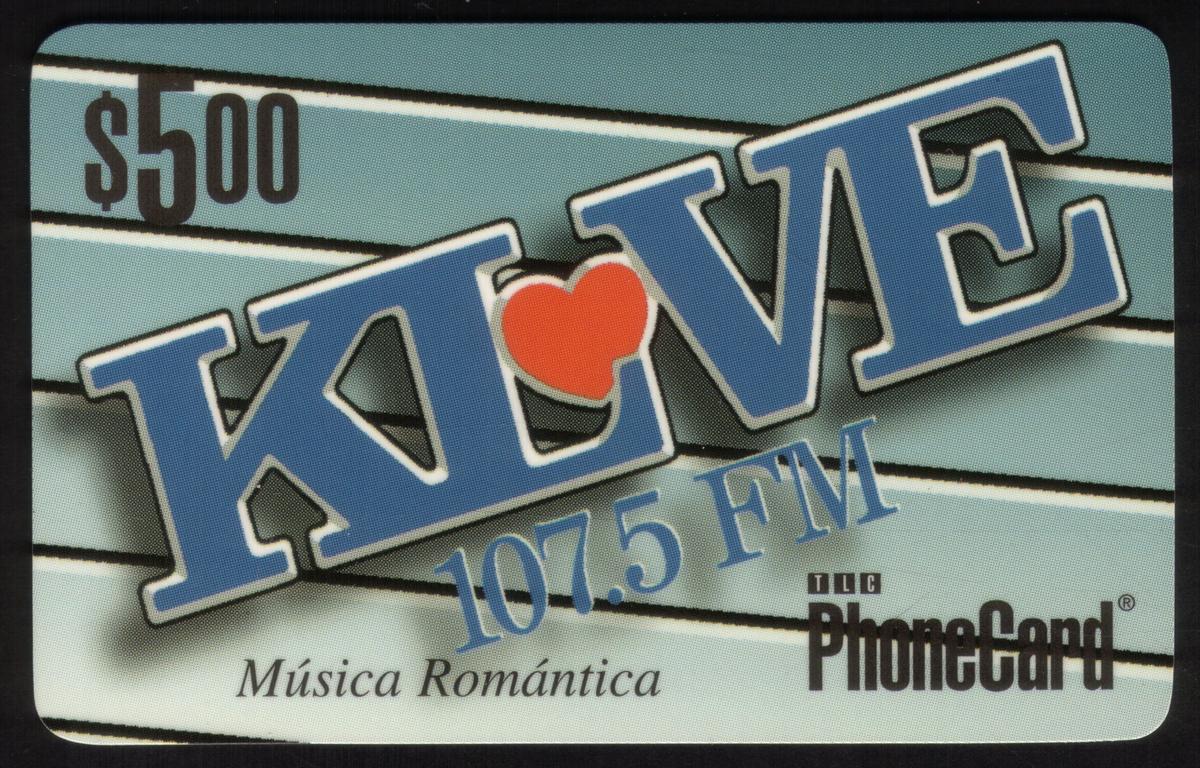 This phone card connects music, romantic themes, and telecommunications, representing a promotional item for KLVE Radio, a radio station serving Spanish-speaking audiences. The overall design and text support the card’s function and affiliation without extra imagery or characters beyond the logos and hearts motif.