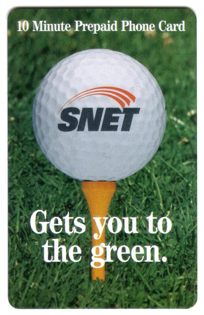 Overall, the card combines elements of golfing — including golf balls, tees, and greens — with corporate advertising for SNET. The design is clean and focused, capturing both the sport and promotional messaging effectively.