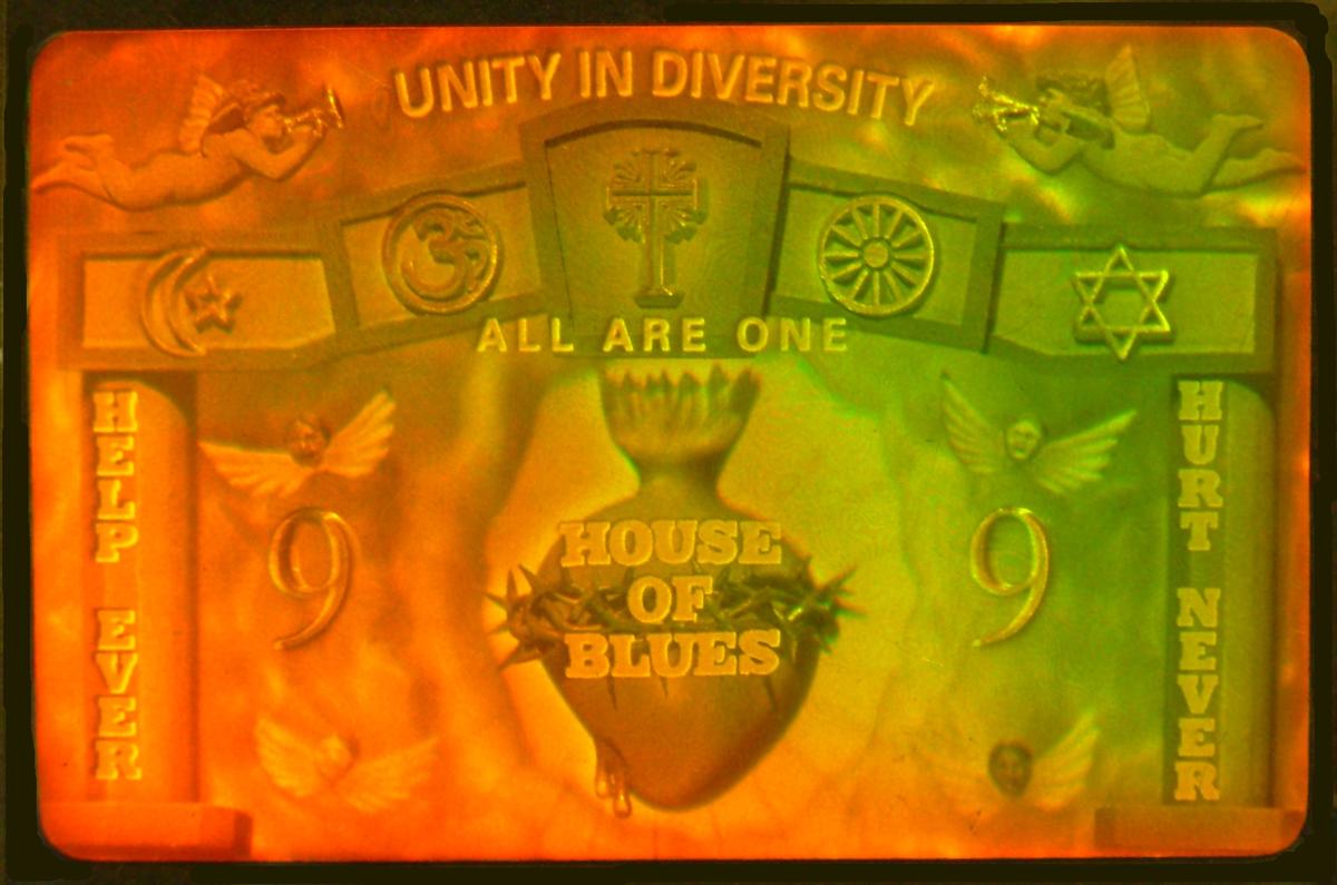 This card connects to cultural and religious unity, referencing Jewish and broader religious themes, aligned with the House of Blues foundation that supports musical arts and African American culture. The card combines promotional elements with spiritual symbolism, making it a notable piece for collectors interested in musical arts, non-profits, and the celebration of cultural diversity.