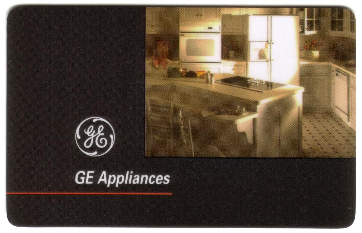 This collectible promotional card features the GE Appliances logo prominently placed at the top right corner. The main image showcases a modern kitchen setting designed with contemporary cabinetry and countertops, emphasizing a clean and stylish décor. Visible in the kitchen are various GE appliances, including a built-in oven with digital controls and a microwave, reflecting typical household kitchen equipment.