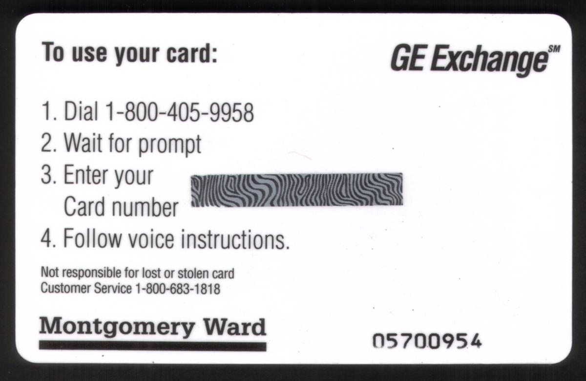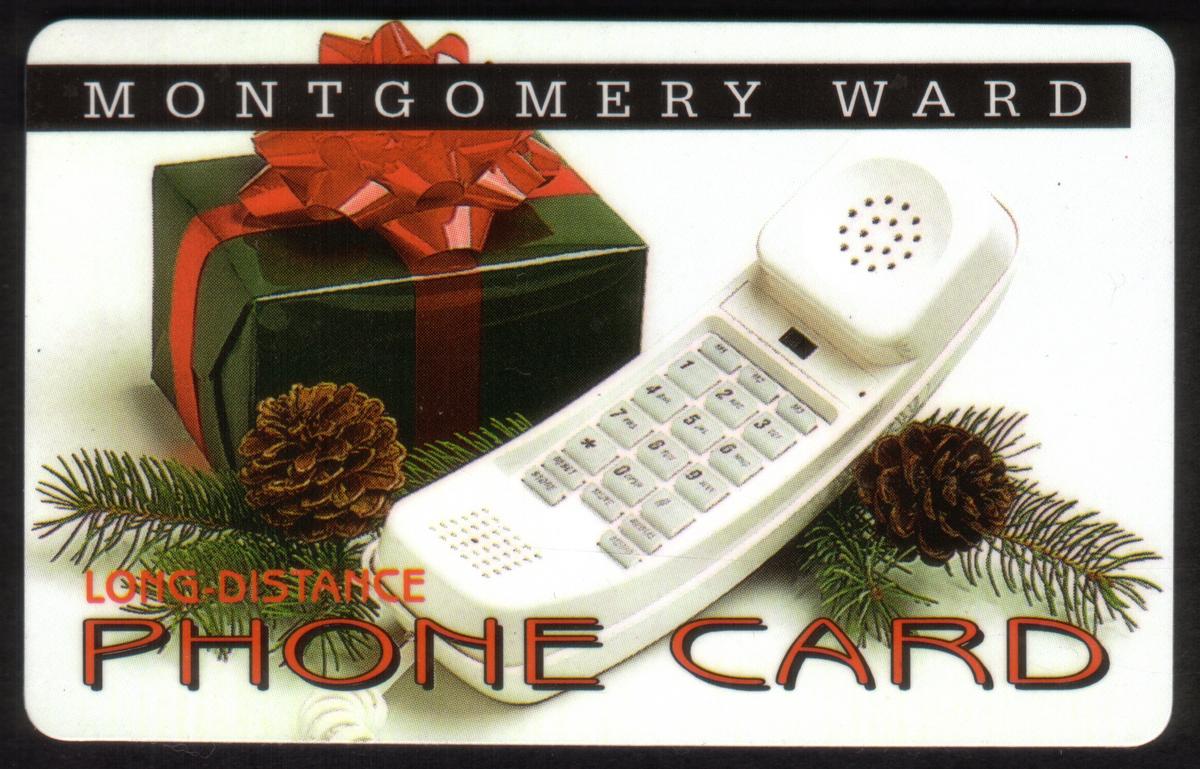 At the top of the card, the text "MONTGOMERY WARD" is displayed in white, uppercase letters on a black rectangular background. Below the telephone and gift image, the words "LONG DISTANCE PHONE CARD" appear in bold letters, with "LONG DISTANCE" in smaller red font and "PHONE CARD" in larger, stylized orange and black lettering.