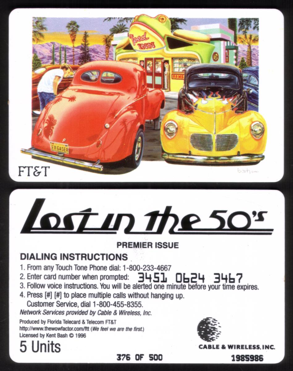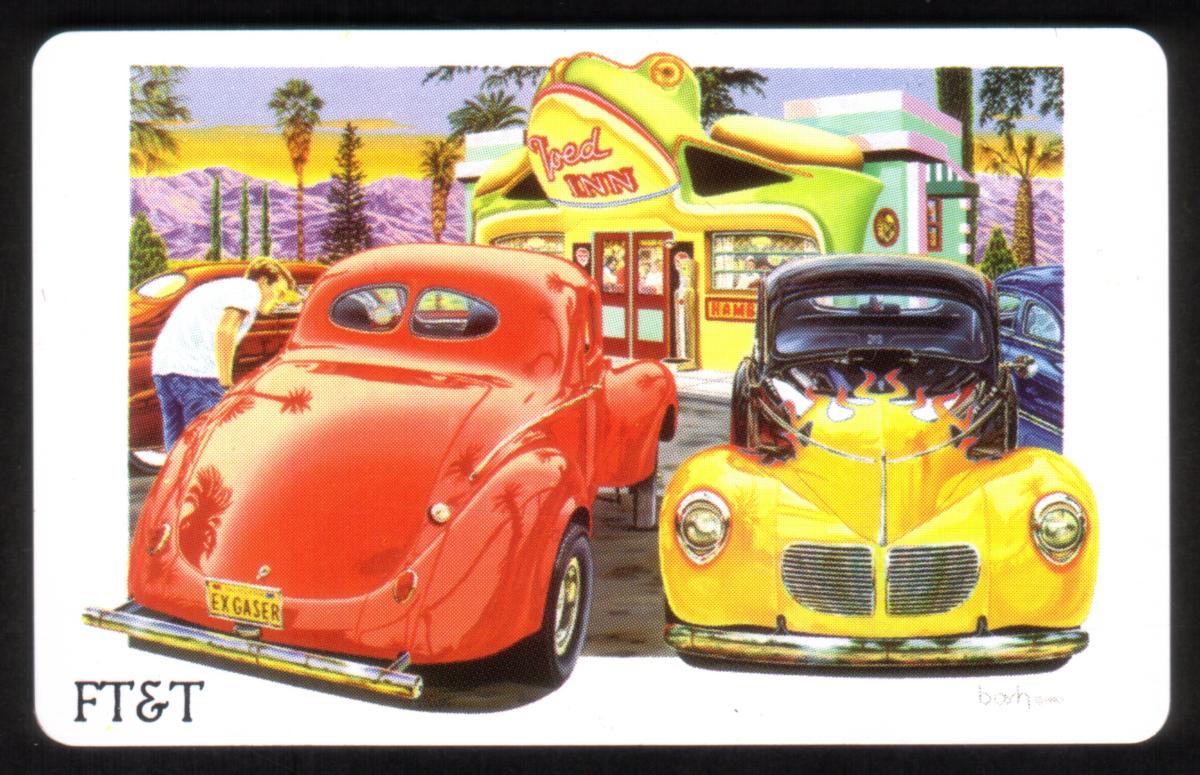 In the foreground left corner of the card, the logo "FT&T" is printed in black. This card is associated with Florida Telecard, and the artistic style highlights the vibrant custom car culture and retro diner aesthetic. The detailed drawing captures scenic elements, including the diner architecture and surrounding natural features, with clear and vivid colors.