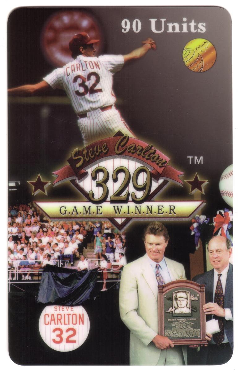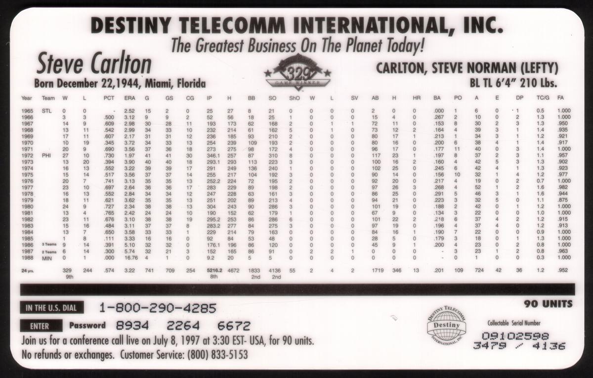 This item is issued by Destiny Telecomm and is an expired 1997 Major League Baseball phone card celebrating Steve Carlton’s career, specifically recognizing his 329 wins as a pitcher. The card merges sports history with collectible telecommunications memorabilia.