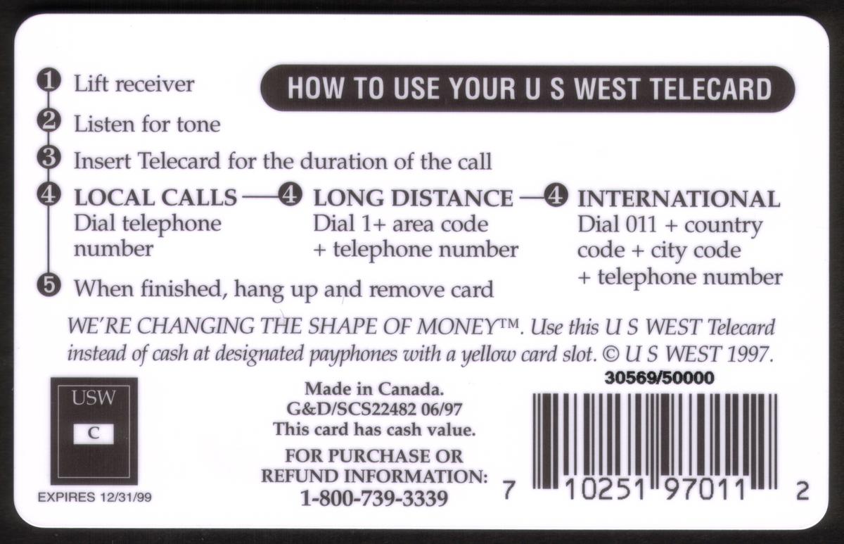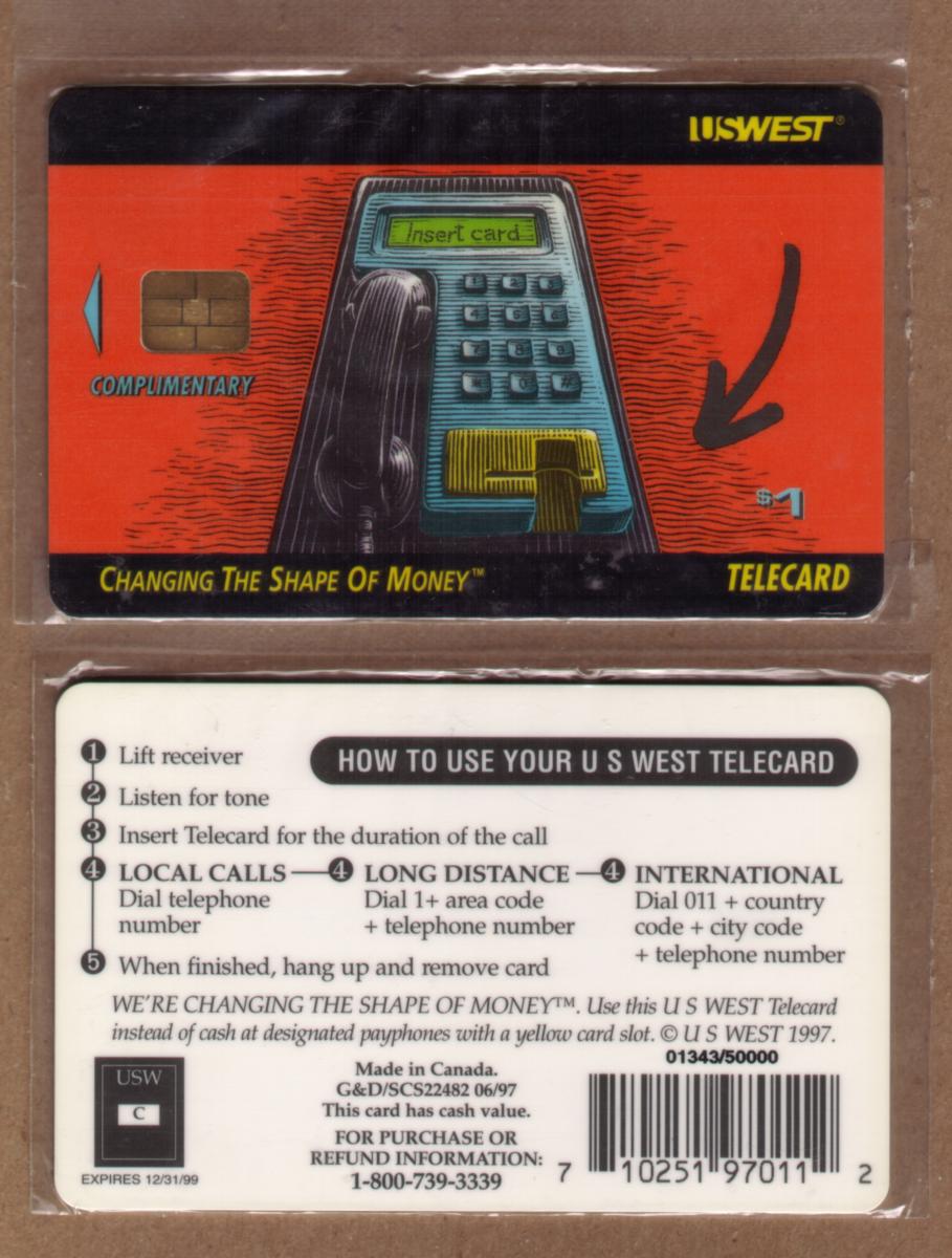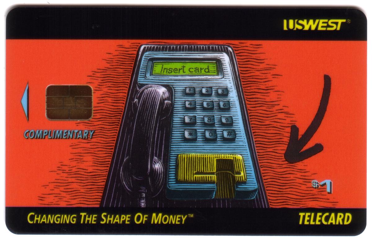 This is a US West promotional chip phone card labeled as a millennium $1 complimentary telecard. It embodies the theme of telecommunications and stored memory associated with payphones and phone cards, representing the transport of money in a new form as stored value on a chip card.