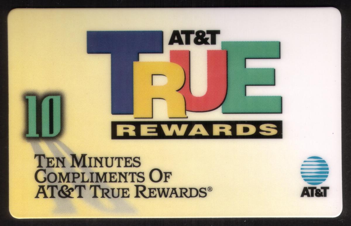 This card is a promotional 10-minute phone card issued by AT&T True Rewards. The card serves as a prepaid calling card that grants the user ten minutes of calling time. The design is clean and simple, focusing on brand recognition and the value offered by the card.