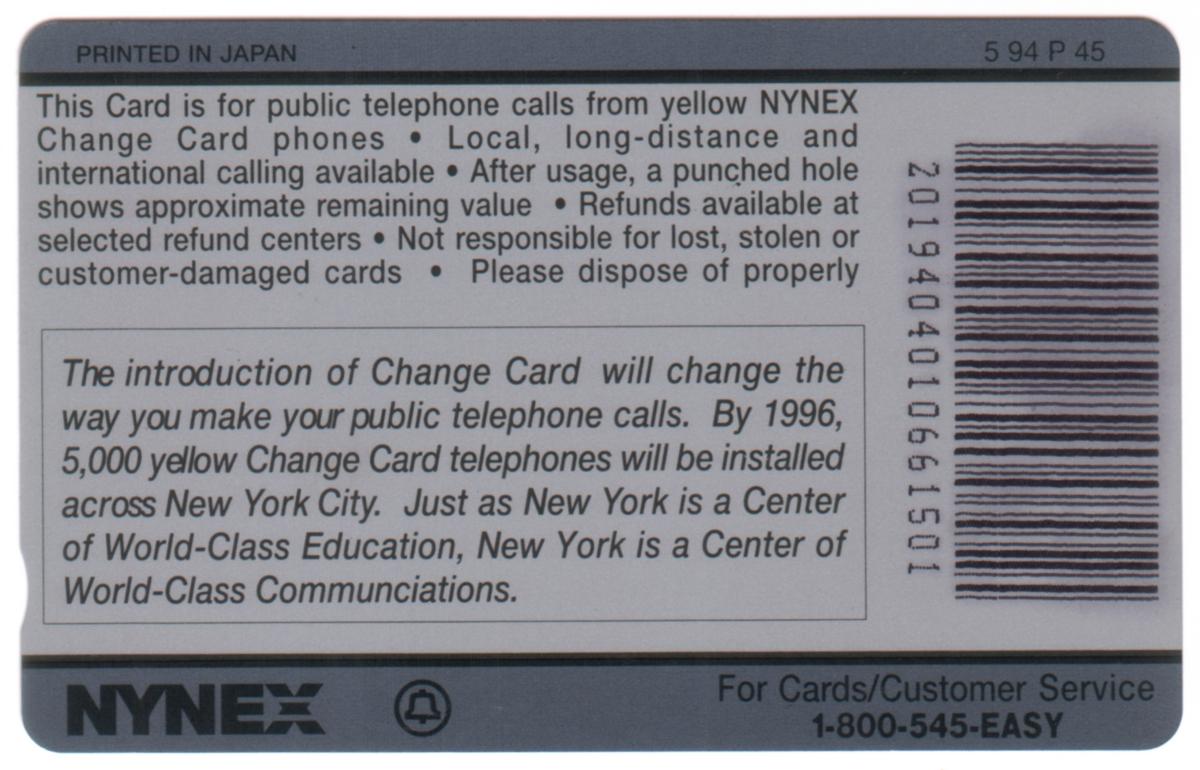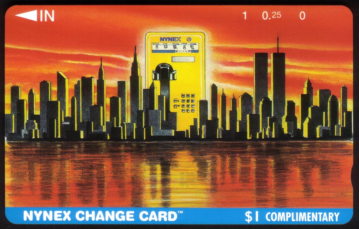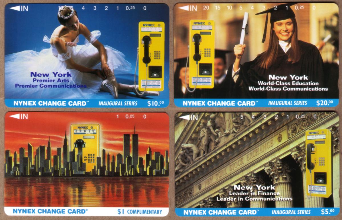 Set of four 1994 NYNEX Change Cards celebrating New York City''s culture, finance, arts, and education, featuring iconic imagery and communication themes. |