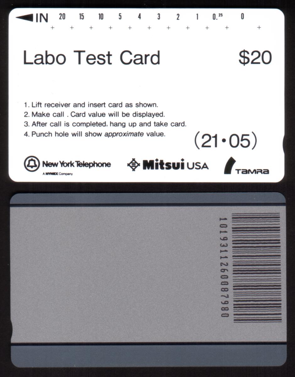 This collectible phone card features the NYNEX and New York Telephone logos, indicating its association with telecommunications services. The card prominently includes the names Mitsui USA and Tamura, suggesting corporate or promotional ties. The denomination displayed on the card is $20, clearly marking its value for telephone usage.