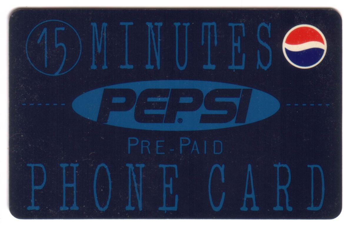 In the upper right corner, the classic Pepsi-Cola logo appears as a round, red, white, and blue circle, consistent with Pepsi’s branding. The overall design is simple yet clearly emphasizes the Pepsi brand and the card’s use as a 15-minute prepaid phone card.