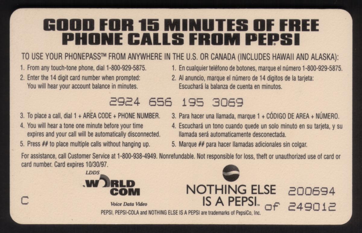 This phone card was issued by LDDS WorldCom, as indicated by the keywords, and is associated with the Pepsi brand and its range of beverages and soft drinks. The card is marked as used and shows the printing number 249,012, confirming its collectible status.