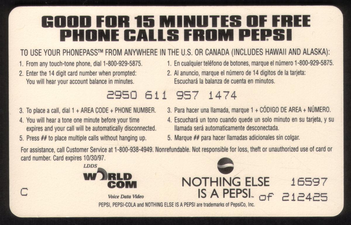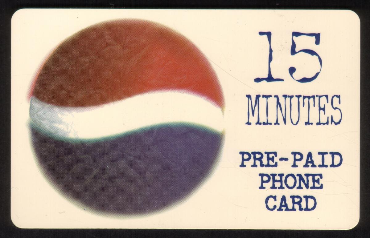 The card clearly indicates a time value of 15 minutes for prepaid phone usage. The overall design is minimalist, focusing on the Pepsi branding and the prepaid calling time, reflecting its promotional nature. The card is used and is associated with WorldCom, as noted in the keywords.