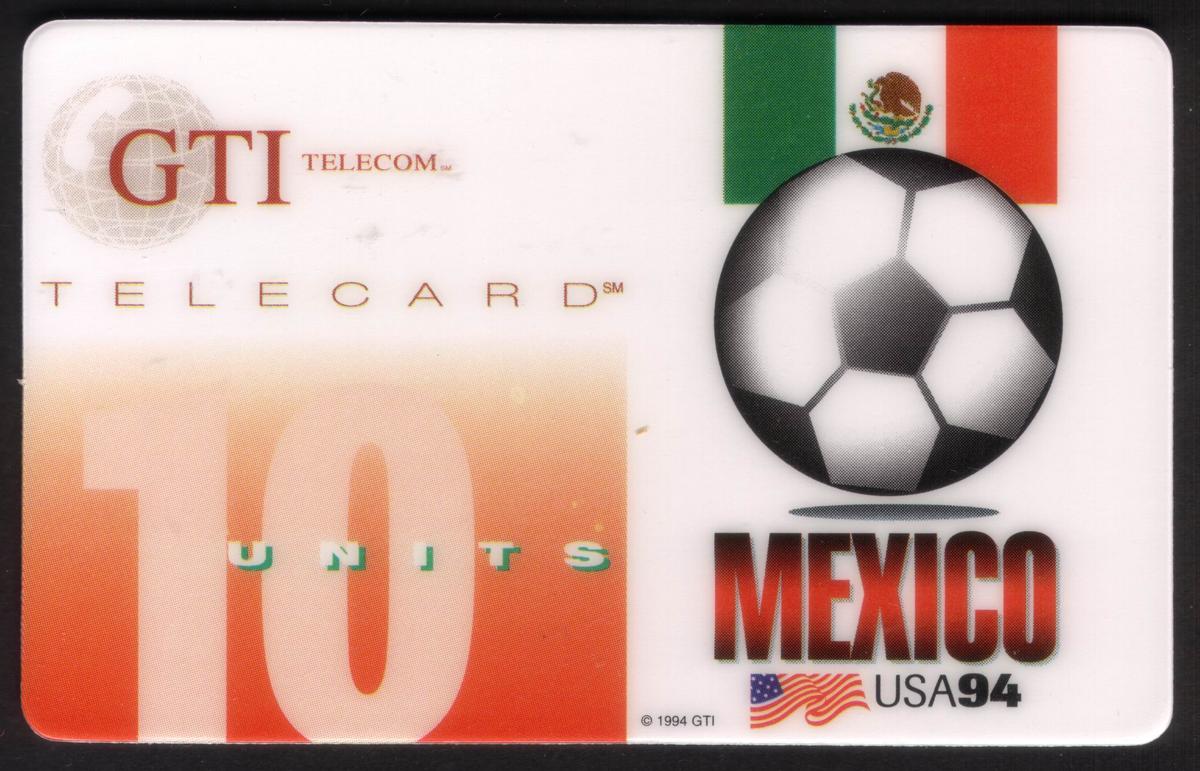 This collection consists of limited edition GTI Telecom telecards issued in 1994, each themed around the FIFA World Cup held in the United States that same year. Each card prominently displays the "GTI Telecom" logo in red along with the word "TELECARD" in gold letters on the left portion, followed by a large gradient number “10” and the word “UNITS” indicating the card’s value. The right side of each card features a stylized black and white soccer ball with a shadow below it, accompanied by the official flag of a participating nation above the ball.