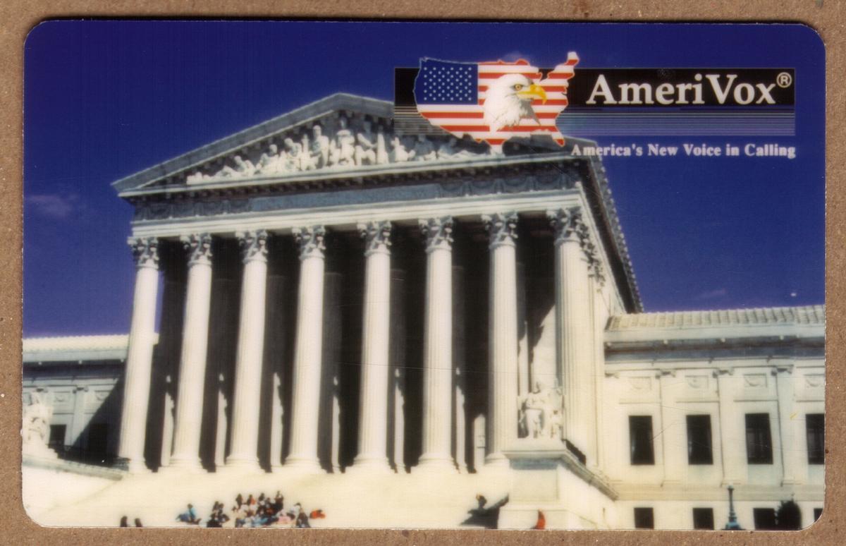 Printed on the card is the denomination "$10" positioned clearly to indicate its value. The card includes text referencing the US Constitution, aligning the image with its role in American history and politics. The card is dated "03/94" and carries the AmeriVox brand name, which is associated with collectible cards. This visually rich card commemorates American historical sights, specifically highlighting one of Washington DC's most notable tourist attractions and its connection to the judicial branch of the United States government.