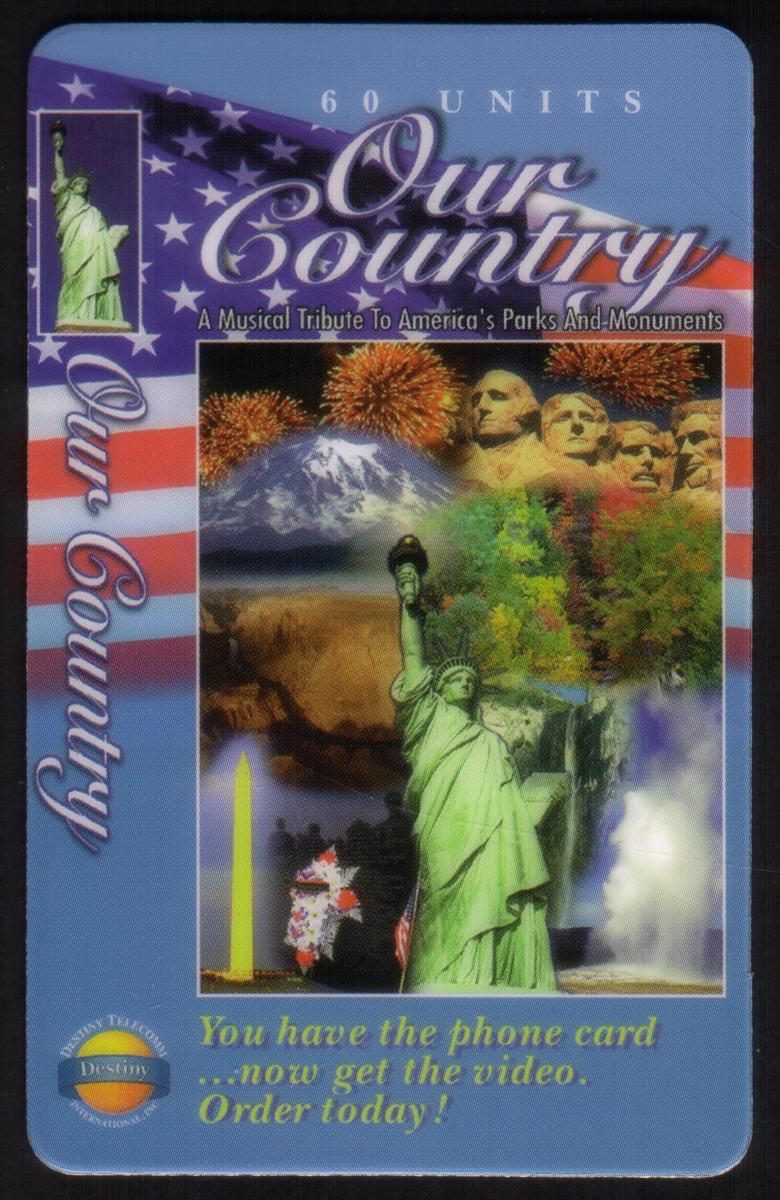 The design integrates multiple elements of American history and sightseeing attractions, emphasizing national monuments that are significant to the country’s heritage. The overall composition uses vivid colors and lighting effects to highlight the monuments and fireworks, creating a celebratory scene that captures the spirit of American pride and travel. The card is issued by Destiny Telecomm, associated with the “Our Country” series, which focuses on American historical landmarks and major sights.