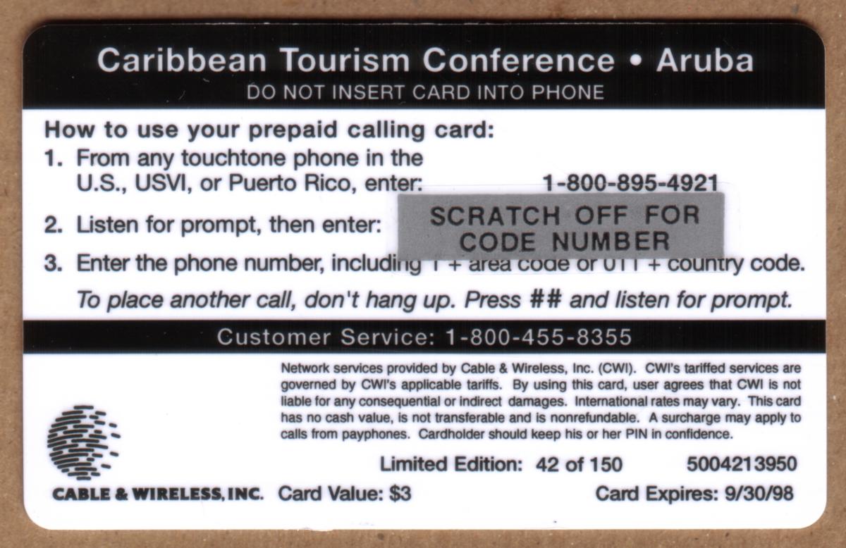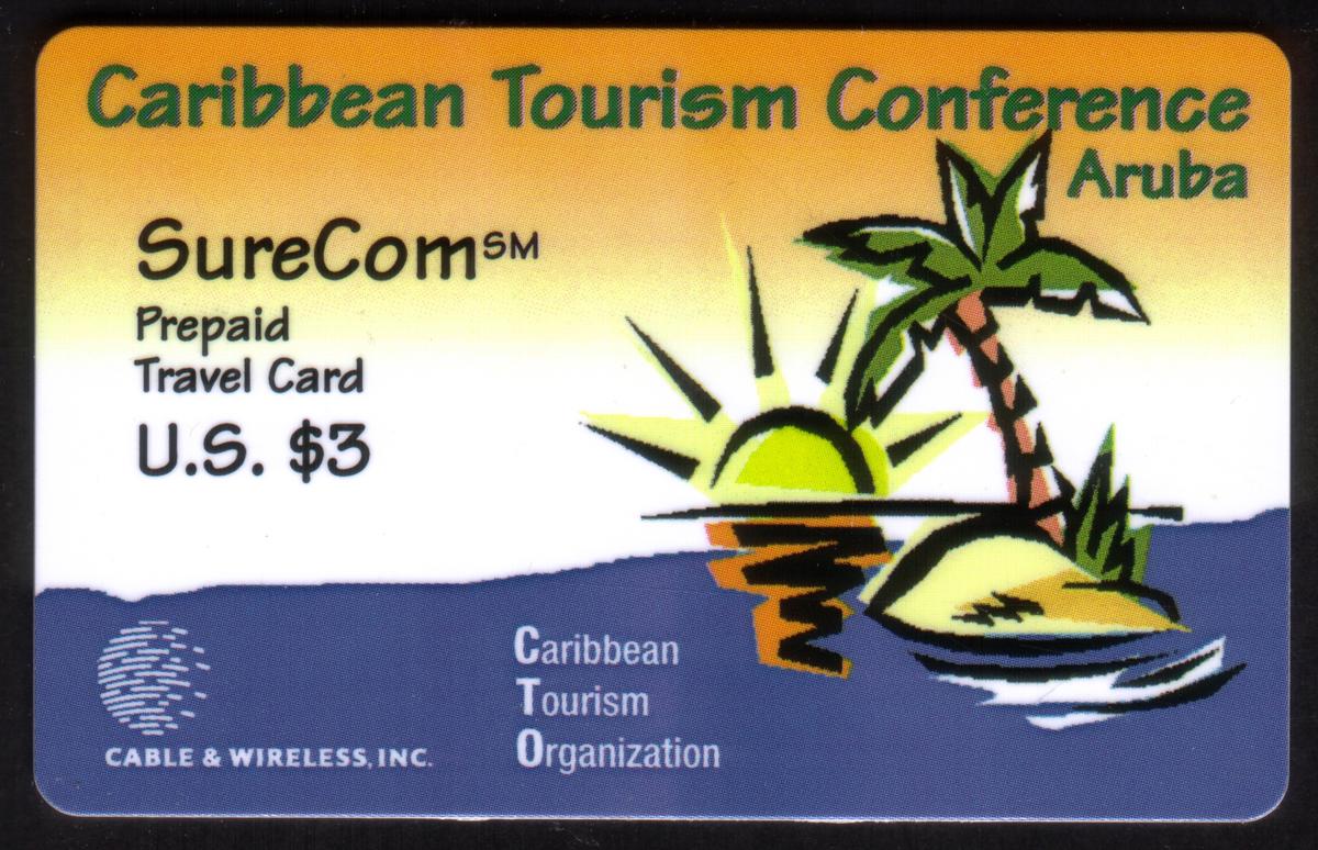 This card represents a prepaid phone card issued by SureCom in association with Cable & Wireless. It is linked to the Caribbean Tourism Organization and commemorates the Caribbean Tourism Conference hosted in Aruba in 1998. The card’s value is clearly marked as three U.S. dollars.