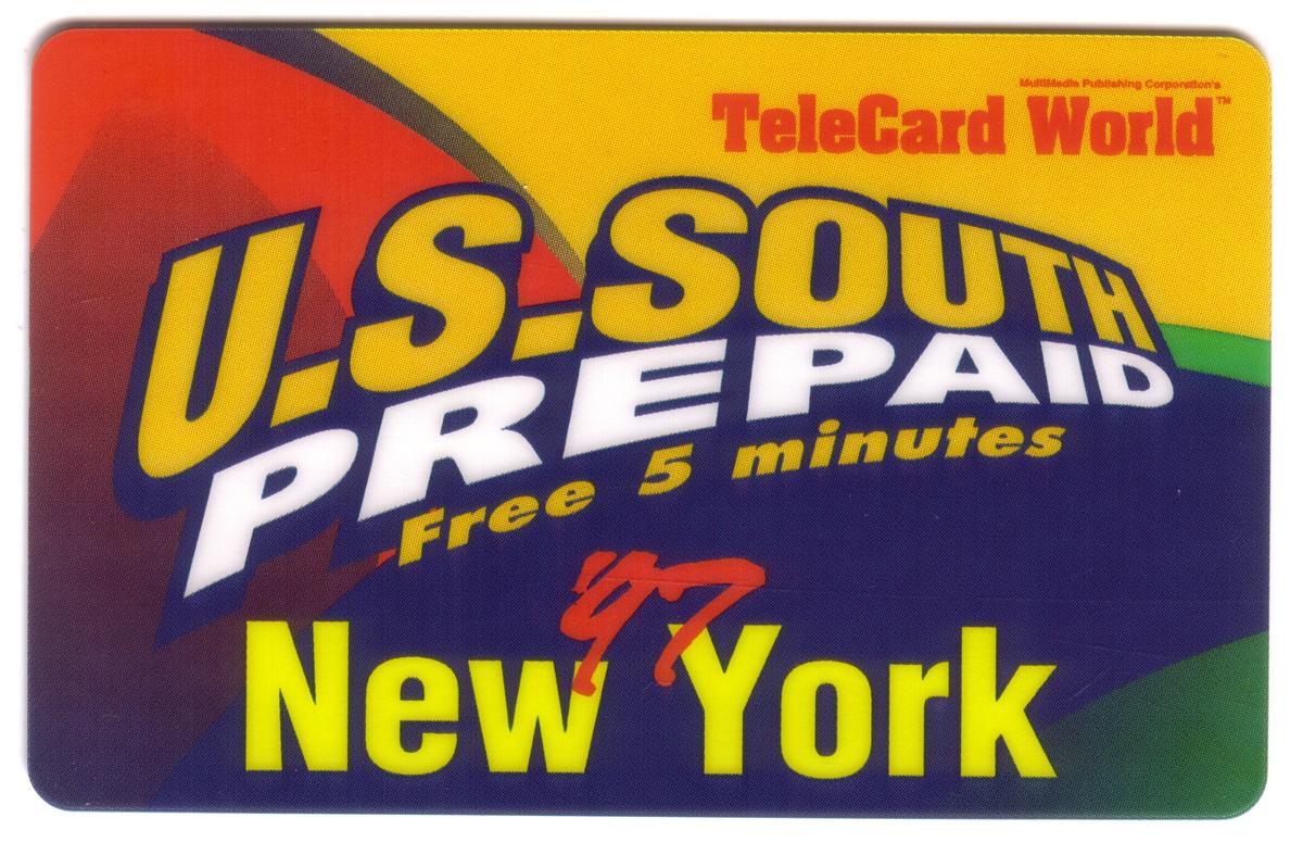 The front of the card includes the branding "U.S. South Commun." and "TeleCard World 1997 (New York)," clearly identifying its connection to both the U.S. South communications sector and the 1997 World TeleCard event held in New York City. The image uses a balanced blend of vibrant colors with sharp lines and geometric patterns that emphasize the modern telecommunications theme of the era.