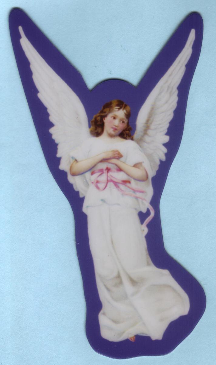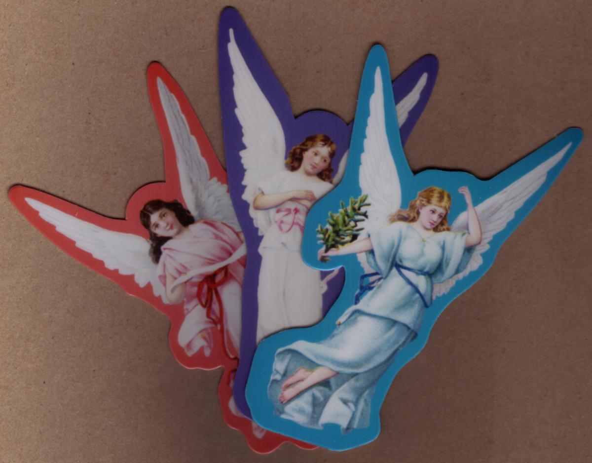 This set of three die-cut collectible cards features angelic figures, each with a distinct colored background: turquoise, purple, and red. Each angel is depicted in a flowing robe with large white wings, embodying themes of spirituality and faith. The first angel on the turquoise background holds a small branch with green leaves and has golden blonde hair styled with soft curls. This figure's robe is primarily white with a blue sash, and the angel is shown in a gentle, step-forward pose.