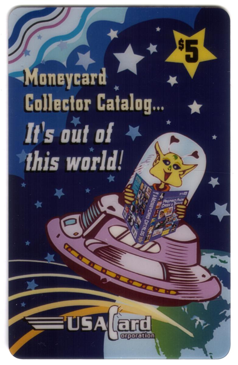 The card prominently displays the value of $5 in the upper right corner. The text "Moneycard Collector Catalog" and "Commemorative: Alien In Spaceship" are printed on the card. The issuer is the USACard Corporation, whose name appears clearly on the front. The overall artistic style is cartoon art, giving the design a playful and imaginative feel focused on classic science fiction elements.