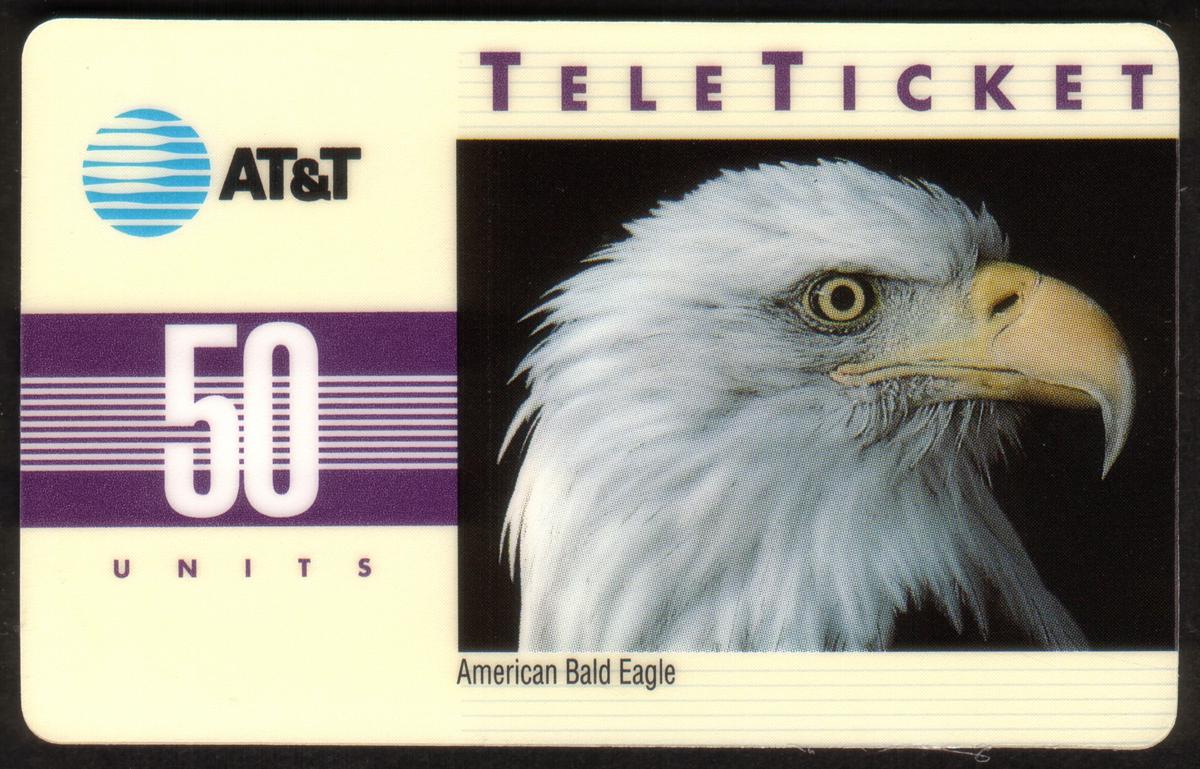 This collectible AT&T Teleticket phone card features a detailed photographic image of a pair of American Bald Eagles in natural surroundings. The two eagles are prominently displayed amidst greenery and branches, emphasizing their majestic appearance and status as a symbol of American wildlife. The card highlights the American Bald Eagle as an emblem of the United States, reflecting its importance as a national symbol and its recognition as an endangered species.