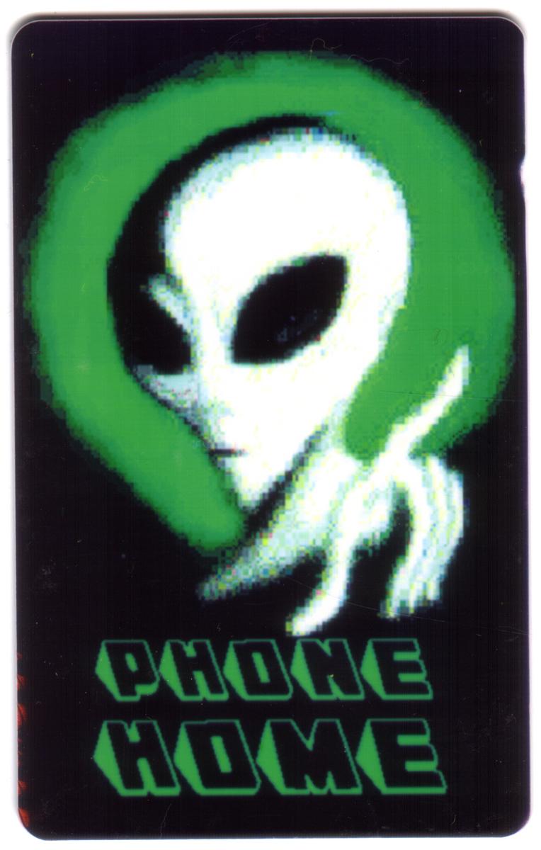Overall, the design balances futuristic art with clear branding elements. The combination of white and green colors on black creates a dramatic visual effect, and the reference to "Phone Home" connects to popular science fiction motifs involving aliens and communication. The card serves as both a collectible item and a functional phone card issued by Precision Telecom Systems.