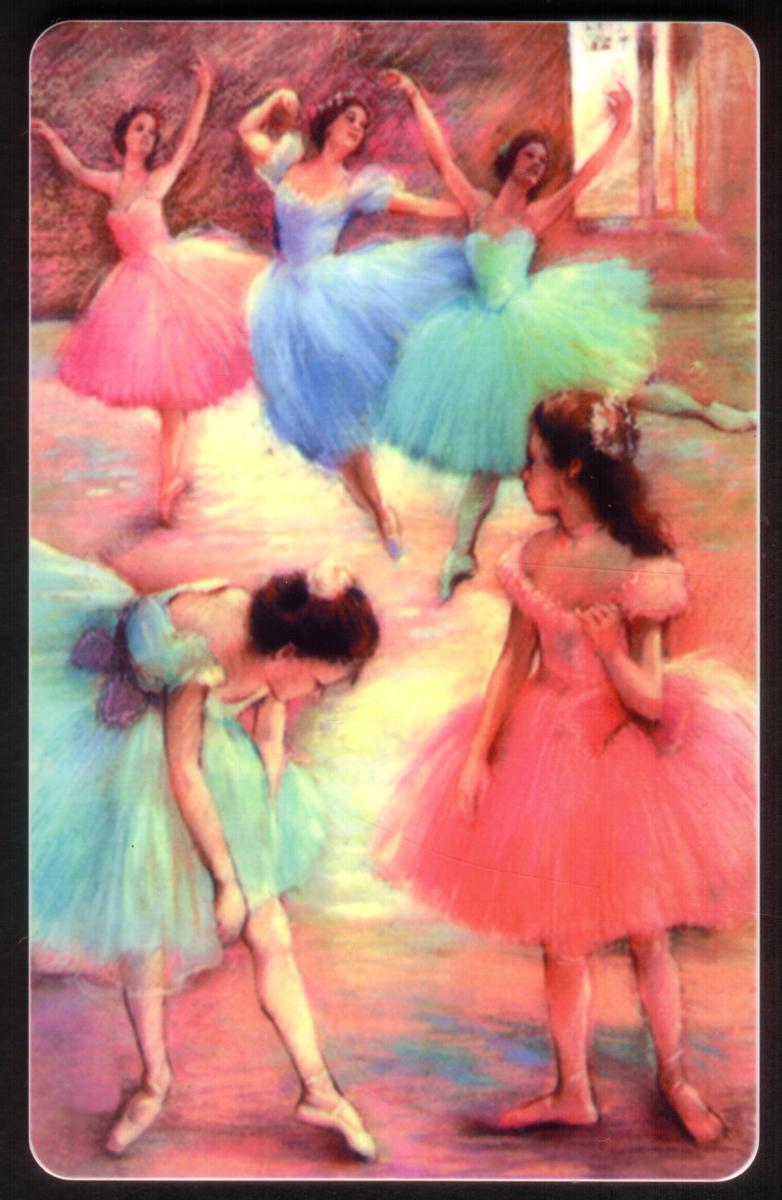 The card includes text labeling it as "Cable & Wireless 5u," indicating its denomination and telecom provider. The painting captures an elegant moment of ballet rehearsal or performance, emphasizing the grace and poise of the dancers. The composition balances action and stillness, with some figures mid-movement and others adjusting their position, enhancing the artistic quality of the image.