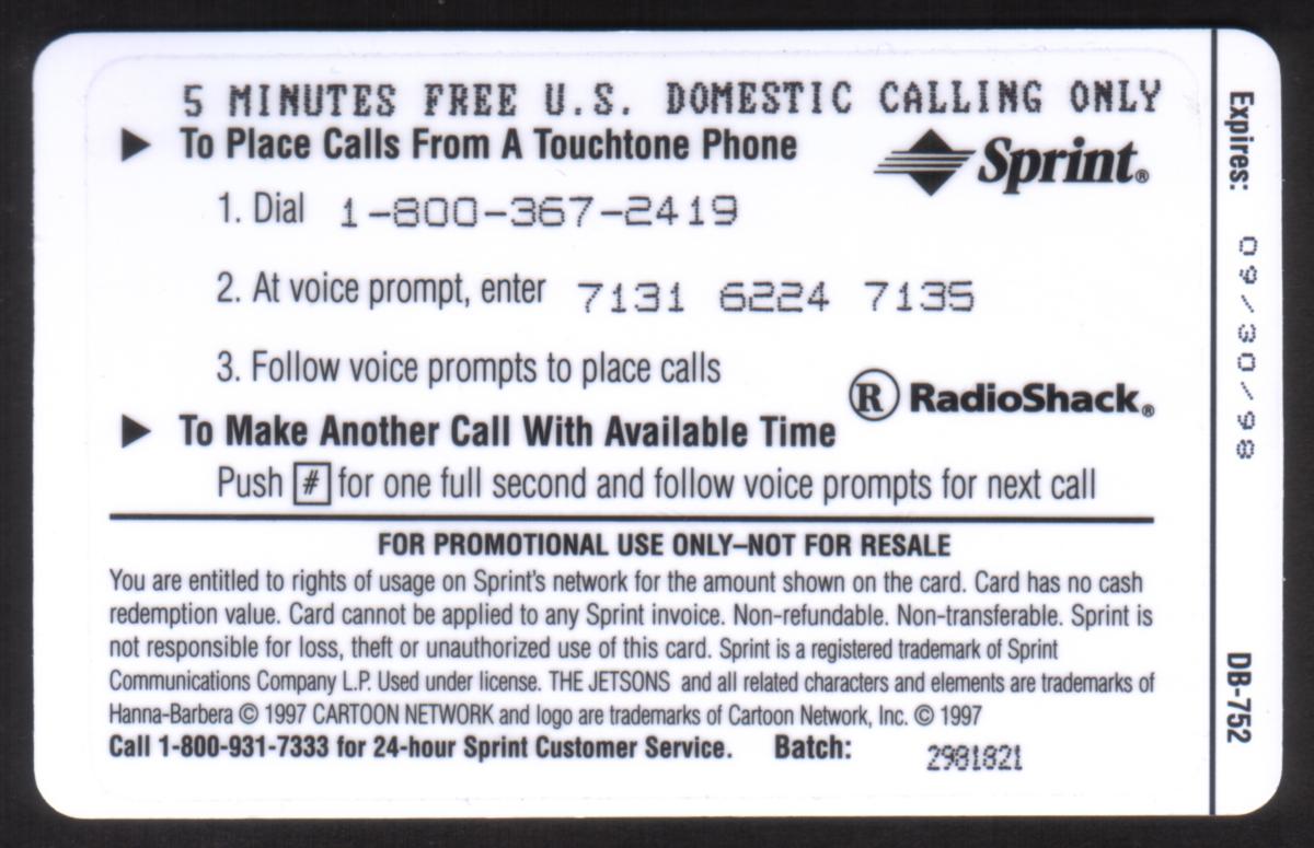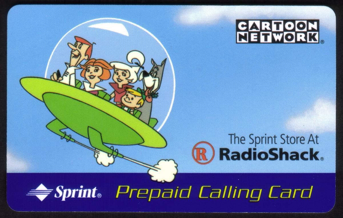 This calling card is a collaboration between Sprint and RadioShack, featuring characters from Hanna-Barbera’s The Jetsons, aligning with themes of space, futuristic living, and classic animation favored by Cartoon Network.