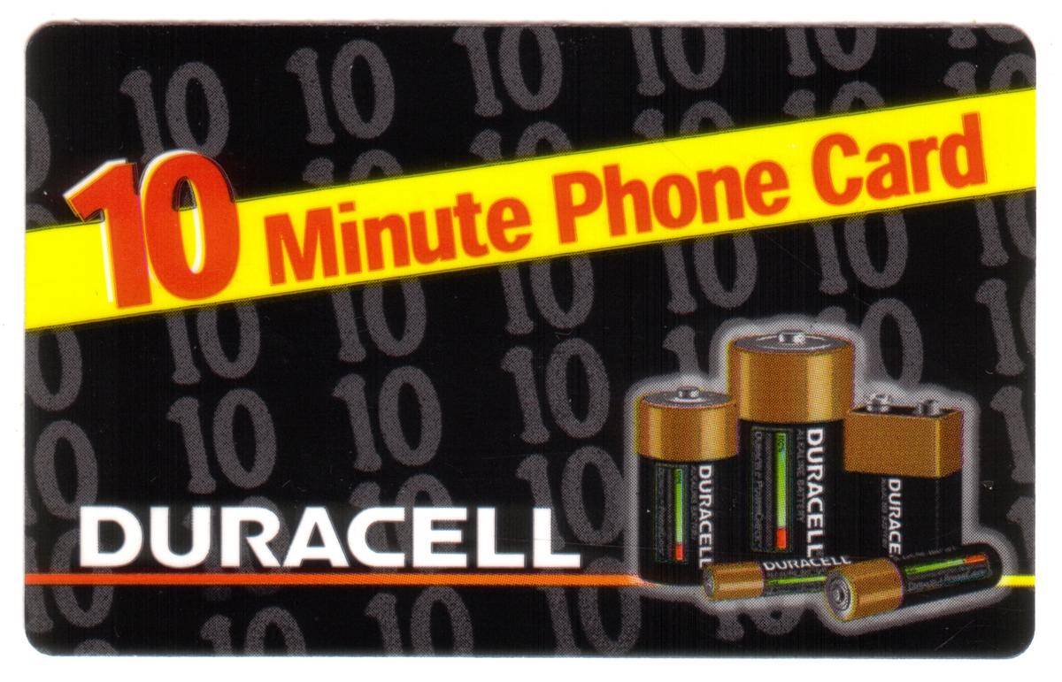 The card also includes the Duracell logo, which consists of the word "Duracell" in bold white letters set against a dark background, enhancing its visibility. Below the image of the batteries and logo, the text "10m Duracell" is present, indicating a possible value or designation related to the phone card’s usage or promotional theme. The presentation clearly conveys the connection to electrical power and energy, consistent with Duracell’s product identity as a battery manufacturer.