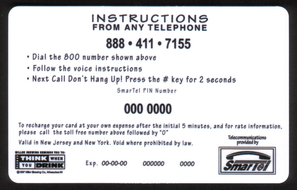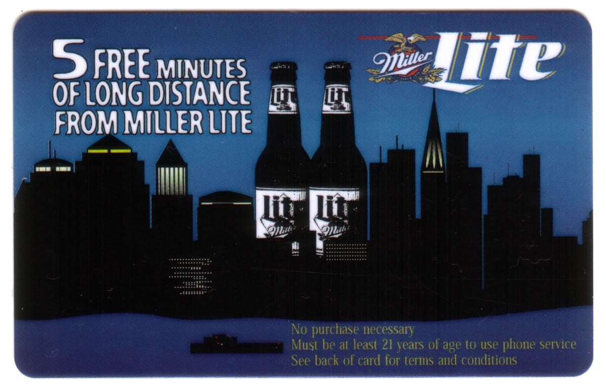 Additional details include several logos and trademarks related to Miller Lite and SmarTel Communication, the latter being the card issuer. The design captures a blend of art and advertising by integrating the beer brand into a creative beach and surfing scene, reinforcing the association between Miller Lite and an active, outdoor lifestyle. The card’s composition emphasizes the brand names and artistic elements without any additional text or imagery beyond those stated.