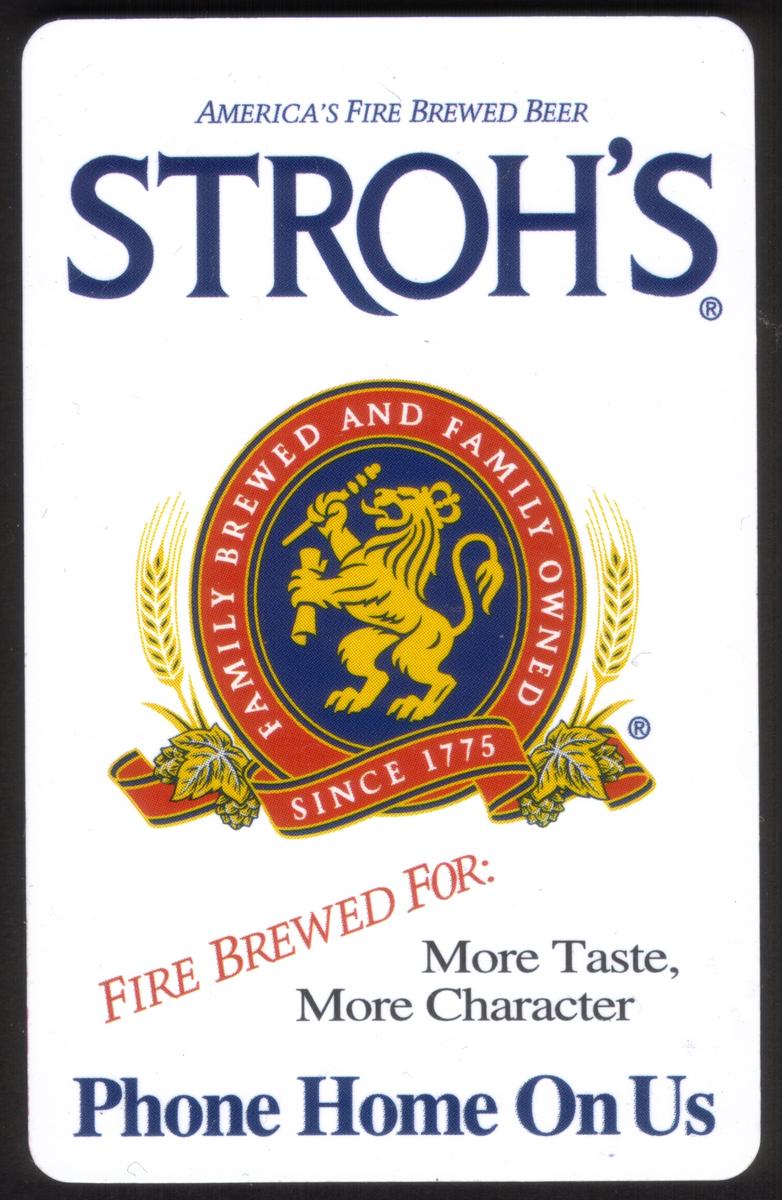This collectible promotional card features branding for Stroh's beer, highlighting the slogan "More Taste More Character." The image prominently displays a large Stroh's logo with the phrase "America's Fire Brewed Beer Since 1775" positioned beneath it. The overall design centers on a bold, vintage-style logo presentation on a dark background.