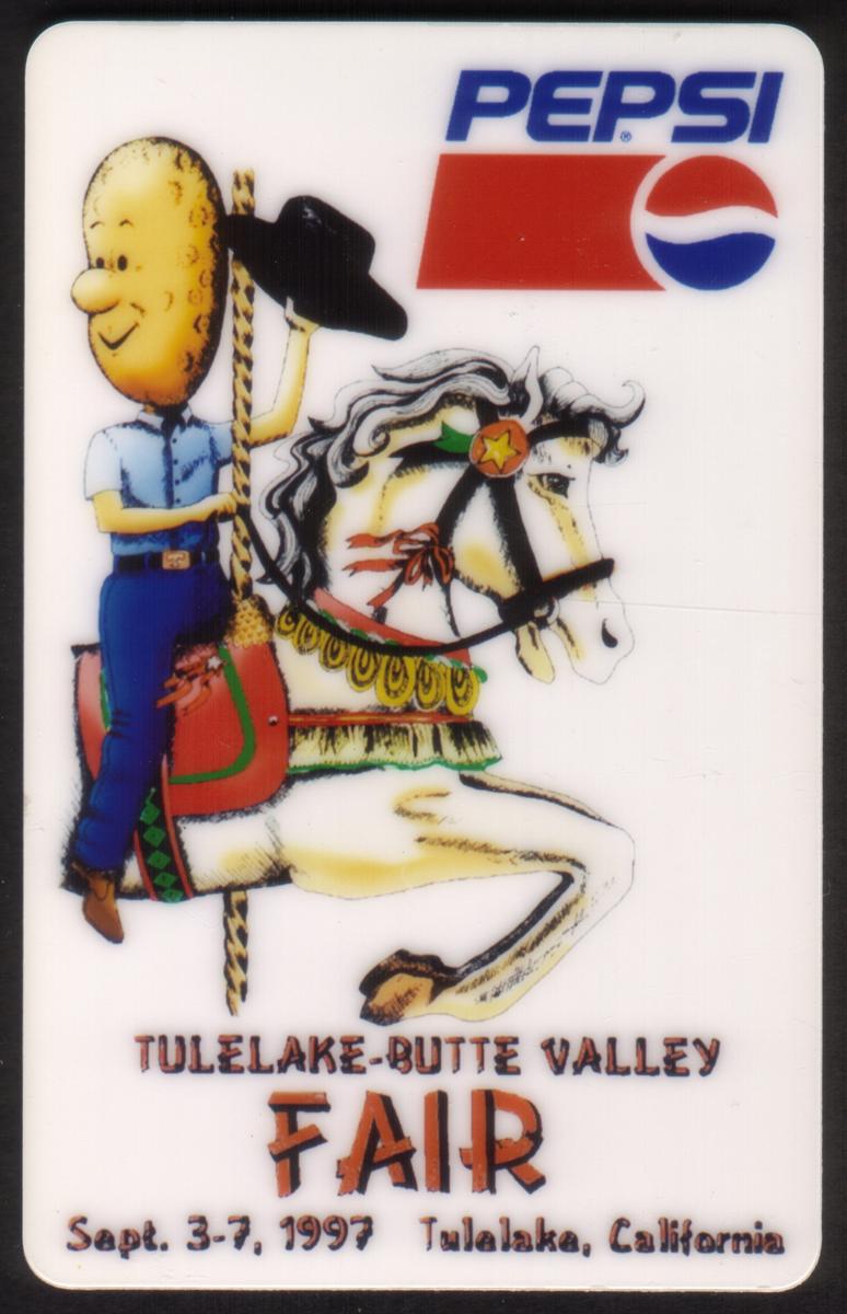 This card commemorates the 1997 Tulelake-Butte Valley Fair in California and features branding by Pepsi-Cola, emphasizing its role as a promotional item related to state fairs and festive rides like merry-go-round horses.