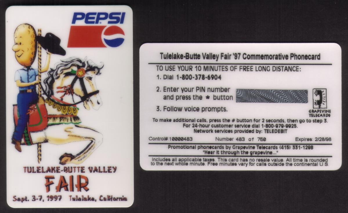 Promotional 1997 Tulelake-Butte Valley Fair phone card featuring vibrant carousel horse artwork, fair details, Pepsi logo, and instructions for free long-distance calls. |