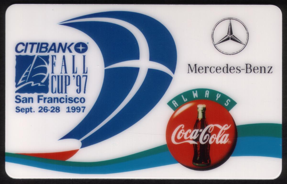 This collectible phone card features an artistic illustration of a sailboat participating in the CitiBank Fall Cup '97 sailing event held in San Francisco, California. The boat’s sails display prominent logos of Coca-Cola and Mercedes-Benz, emphasizing the sponsorship connection to major global brands. The design highlights the dynamic motion of the sailboat on the water, emphasizing the themes of sailing and competitive yachting, particularly connected to the America's Cup context.